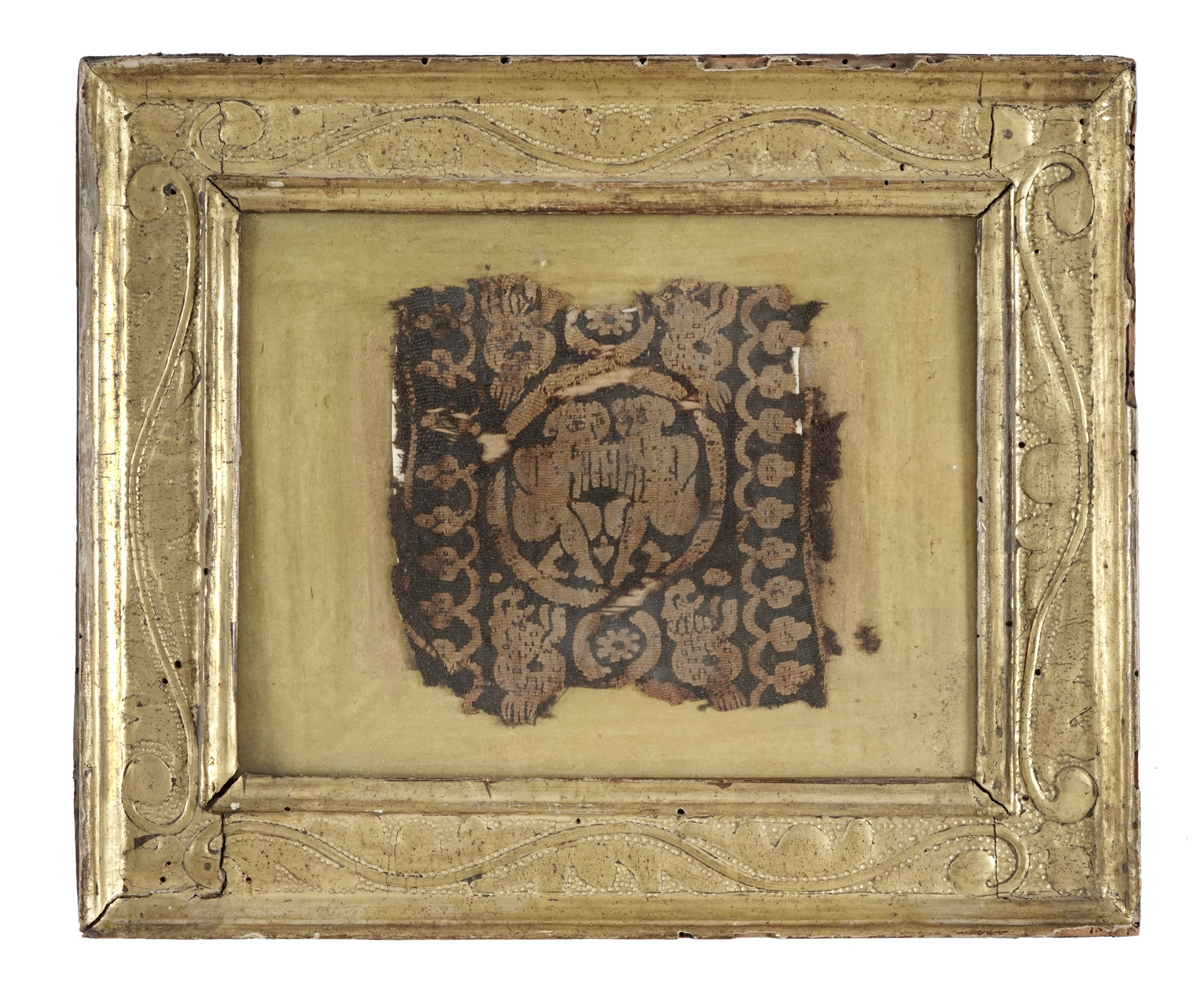 Frammento di bordura in lino. cm 12,5x13. Le stoffe copte ritrovate in Egitto furono portate in Europa fin dal XVII secolo, come semplici curiosità. Solamente a partire dai primi decenni del XX secolo divennero oggetto di una vera e propria indagine storico-artistica. La maggior parte dei reperti sono datati fra il IV e il X secolo, e solitamente si tratta di frammenti di tuniche o di parti del loro ornamento. La tunica era decorata da clavi, cioè bordi ornamentali che, dalle spalle, scendevano sulla schiena e sul petto. Sulle spalle e sul petto, o sulla parte inferiore della tunica potevano trovarsi anche delle tabulae o degli orbiculi, ovvero degli inserti ornamentali rispettivamente di forma quadrata o circolare, monocromi o policromi. Inoltre, spesso un bordo ornamentale circondava il fondo della tunica, delle maniche e della scollatura, diventando talvolta, in quest'ultimo caso, un vero e proprio pettorale. Provenienza: Collezione Tammaro De Marinis. (1) In antica cornice dorata. Con la cornice: cm 250x300.