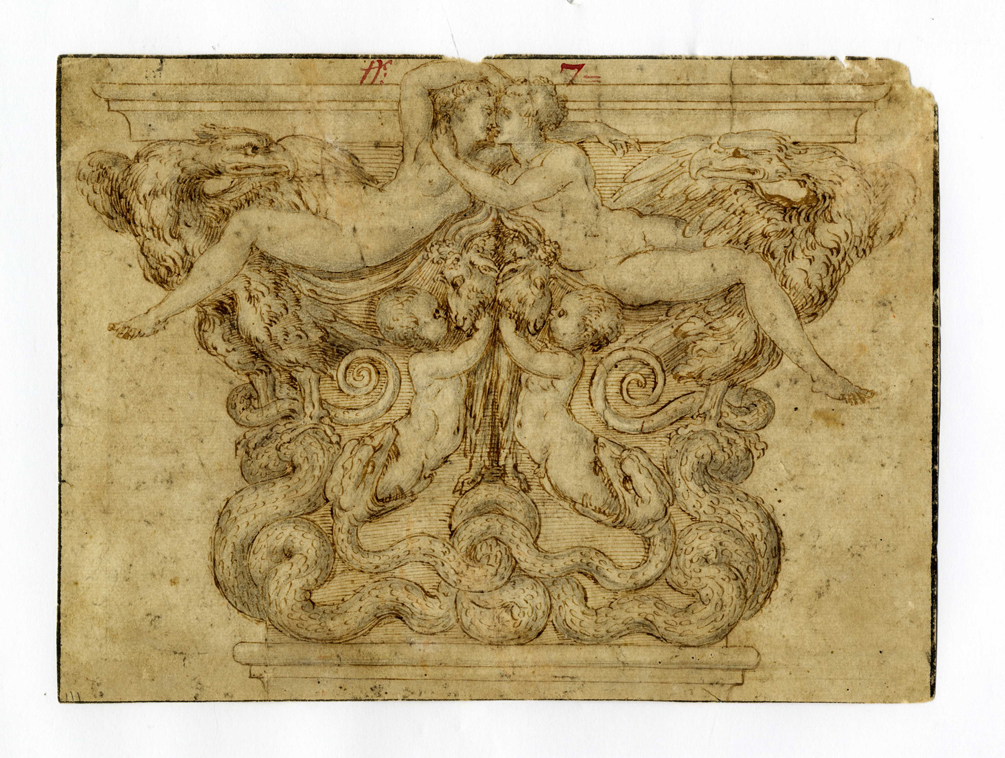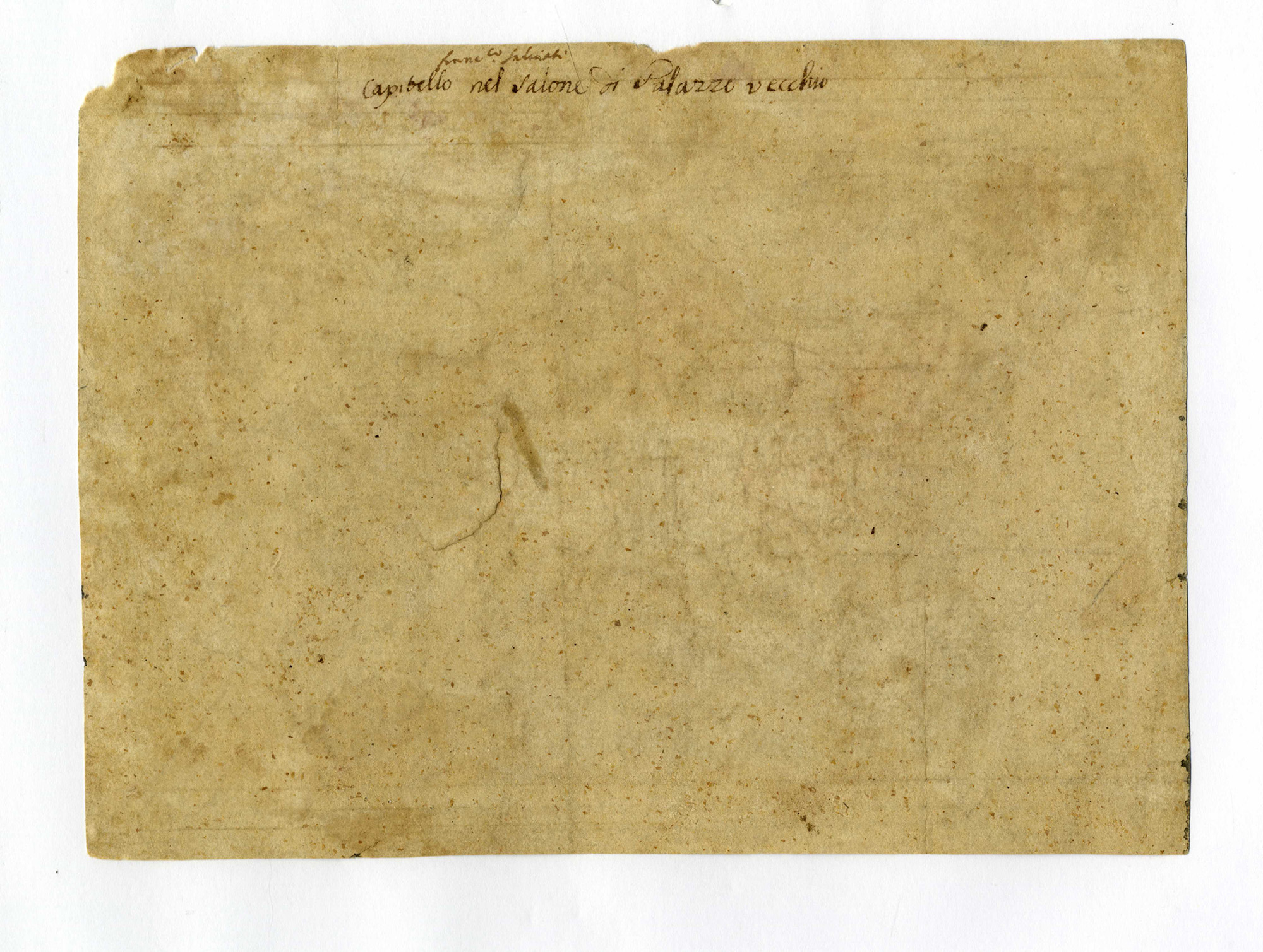 Penna e inchiostro bruno, pennello e acquerello grigio, traccia di rialzi in bianco, carta vergellata color beige con filigrana "corona" (similea Briquet 5076, 1545). In alto al recto notazione a inchiostro rosso scuro "N°" e più distante il numero "7". In alto al verso a penna e inchiostro bruno "franc.co Salviati /capitello nel salone di Palazzo vecchio". mm 184x250. Al recto in basso a sinistra si intravede il marchio di collezione di Charles Paul Jean-Baptiste de Bourgevin Vialart de Saint-Morys (Paris 1743-Île d'Houat 1795), (Lugt, 474). (1) Due piccole mancanze di carta in alto al centro e all'angolo destro. Alcune fragilità.