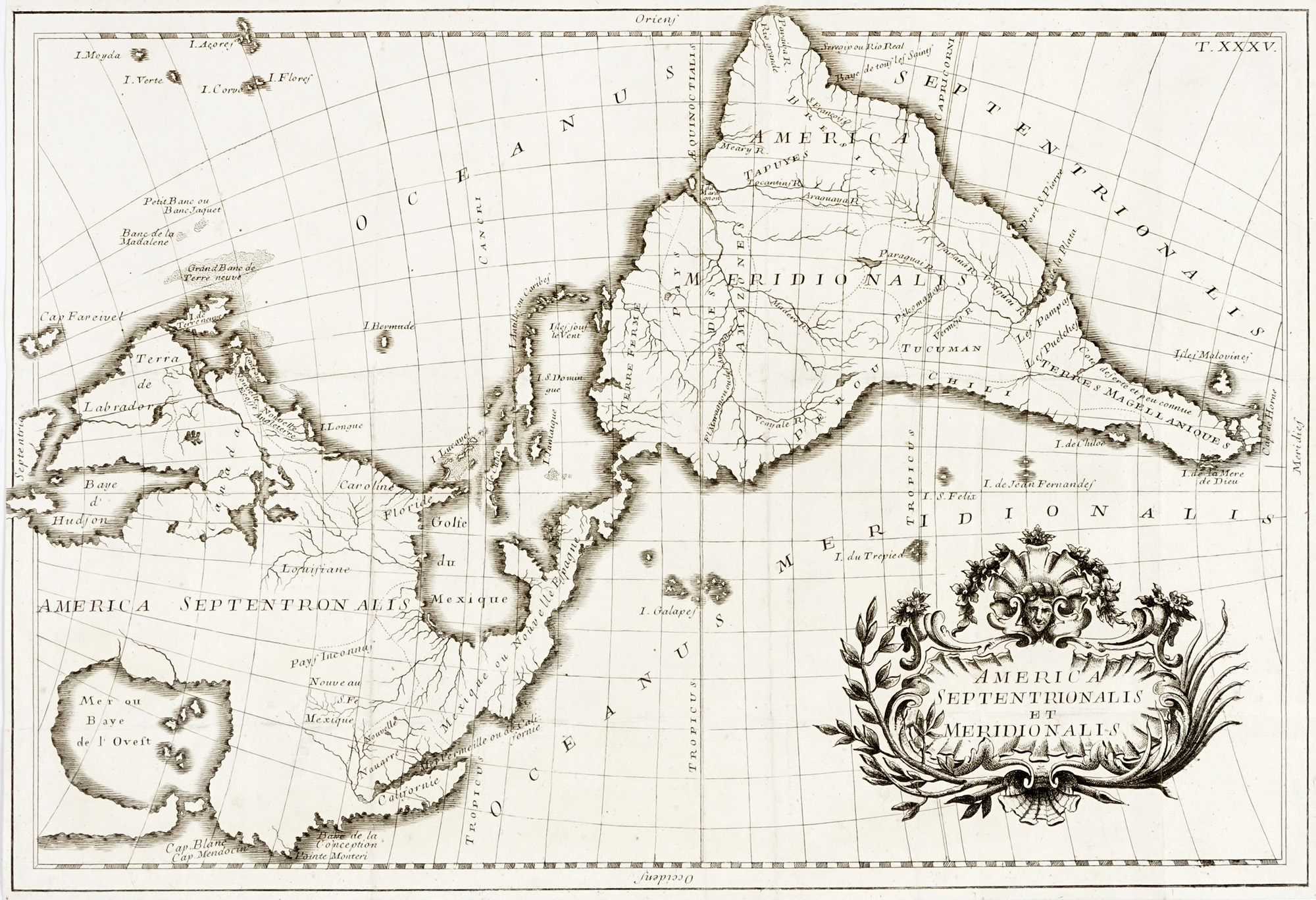 Incisione in rame. mm 460x315. Rilievo attribuito a Giovanni Battista Ghigi, cartografo attivo nella seconda metà del XVIII secolo. Carta tratta da edizione tarda della Geographia antiqua in Compendium Redacta di Christoph Cellarius, Roma 1774, pubblicata dopo la sua morte. Questa tavola viene aggiunta come tavola XXXV e non compare in nessuna delle edizioni precedenti. Mappa non comune dell'America con proiezione orientata con l'Est in alto. Insolita la configurazione della Baia dell'Ovest, presenti il Nuovo Messico, la Louisiana, la Carolina, la Florida, il Labrador, il Canada, il New England, la California e i vari paesi del Sud America, tra cui il Pays Des Amazons e Tucuman. La carta riproduce la mappa murale dell'America Janvier-Longchamp, rara mappa francese anch'essa orientata con l'Est in alto. (1) Esemplare rifilato alla battuta del rame, visibile a tratti. Pieghe editoriali da inserimento in volume.