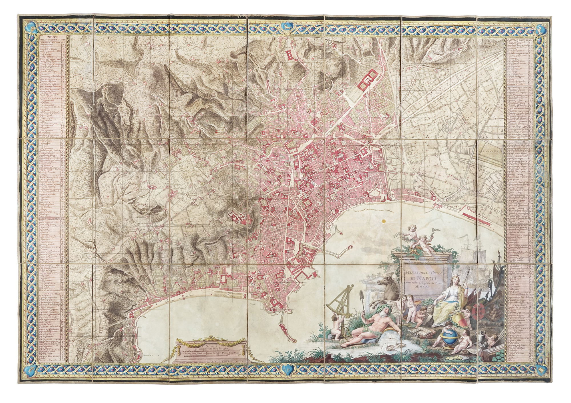 Incisione in rame in coloritura. mm 555x815 (formato aperto). mm 190x118 (formato chiuso). Mappa incisa da Giuseppe Guerra (la firma in basso a destra è coperta dal bordo della tela). Due ampie legende dei luoghi notevoli occupano le fasce laterali, in basso a destra elaborato cartiglio decorativo per il titolo e al centro la tabella con due scale grafiche, in tese parigine e in palmi napoletani, dove si legge il nome di Ricci Zannoni. La bordura decorativa riporta i nomi di numerose famiglie nobili napoletane. (1) Mappa intelata in 21 fogli a stacco. Traccia di aloni dalla parte della tela, segni d'uso.