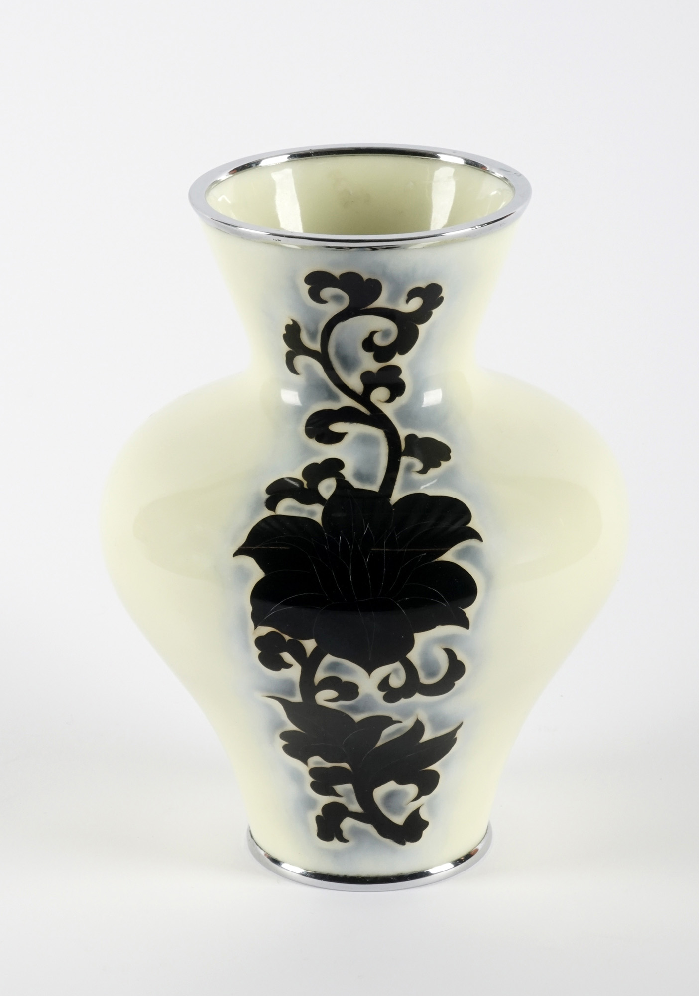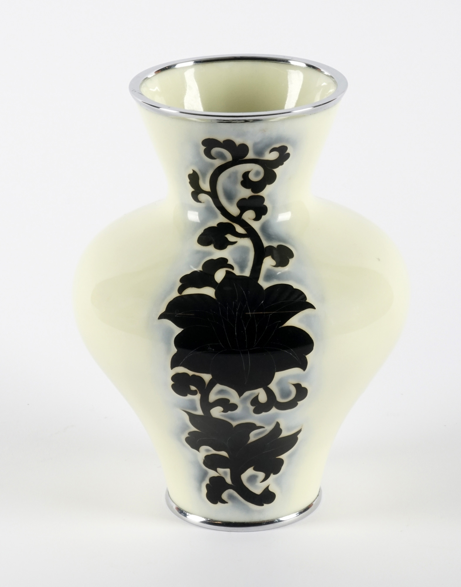 Vaso in metallo cloisonné smaltato con disegno floreale nero e ombreggiatura su fondo color crema. Collo e piede con anello in argento. Marchio della manifattura Ando sull'anello sotto la base. cm 23,5 h. apertura Ø cm 11. Piede Ø cm 8,3. Nagoya e l'area circostante furono il principale centro di produzione cloisonné in Giappone durante il periodo Meiji. La più influente, innovativa e produttiva tra le tante aziende fu la Andō Company, fondata nel 1880 da Maeda Matsukichi e successivamente gestita da Andō Jūbei (1876–1953). Intorno al 1900 la Società Andō venne nominata fornitrice ufficiale di cloisonné dell'Agenzia della Casa Imperiale e divenne il principale fornitore di smalti di alta qualità per i doni imperiali. Bibliografia: Gregory Irvine, Japanese Cloisonné: The Seven Treasures, London, 2006, p. 98. (1) Conservazione ottima.