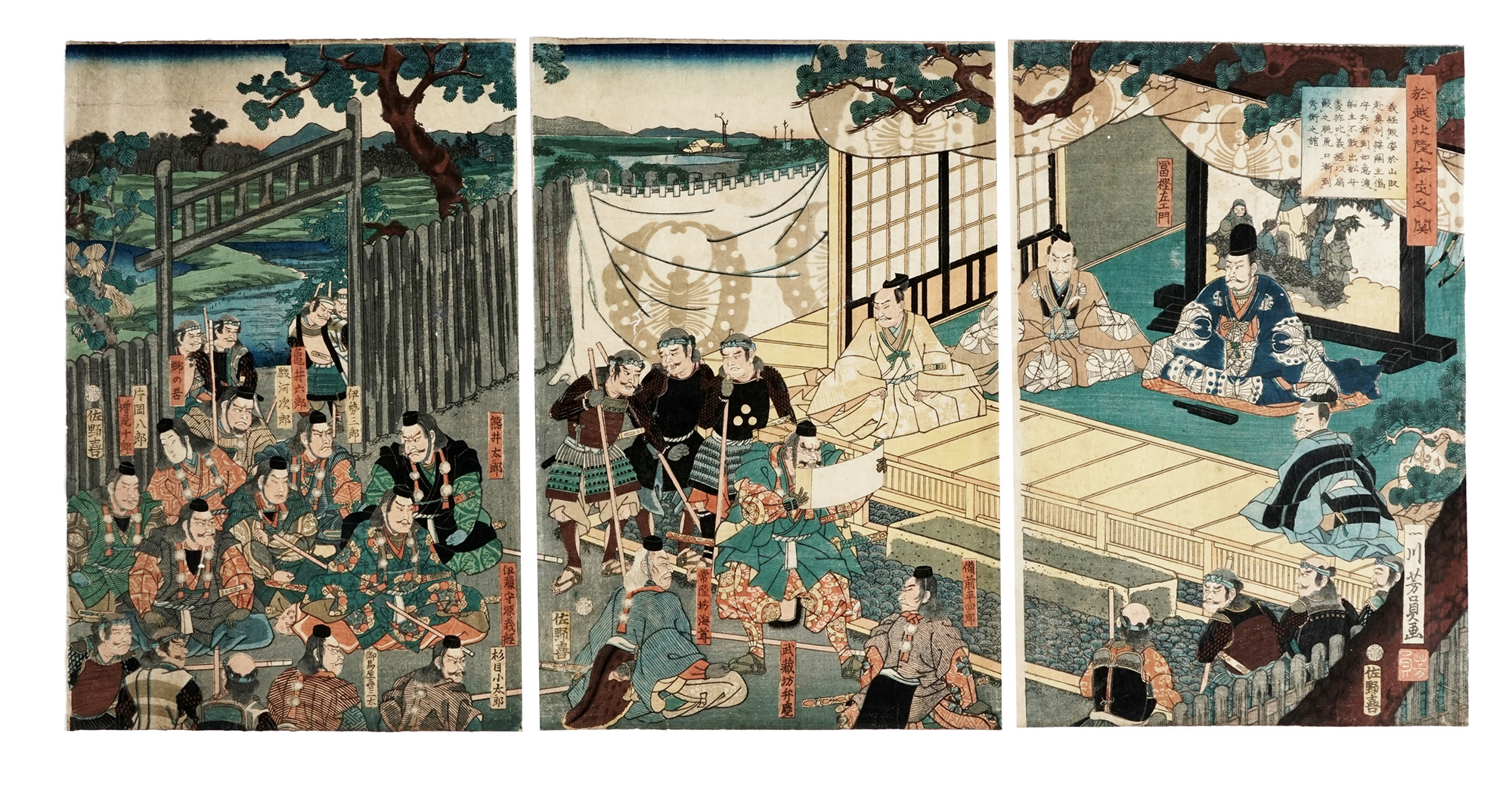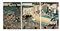 Nishike-e (xilografia a colori). Formato: trittico in tavole sciolte (365x245 mm foglio, mm 364x730). Allievo di Utagawa Kuniyoshi attivo fino al 1870 circa, ricordato per immagini di battaglie, di guerrieri, uccelli e fiori e illustrazioni di Kusazoshi. (3) Colori ben conservati, lievissime tracce d'uso.