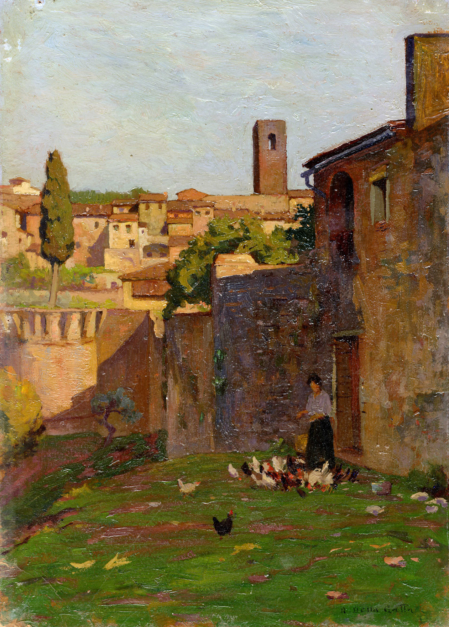 Olio su cartone. cm 34,8x25. Firmato in basso a destra. (1) Opera totalmente applicata a tavola di supporto. Difetti marginali con graffietti sparsi. Buona conservazione generale.