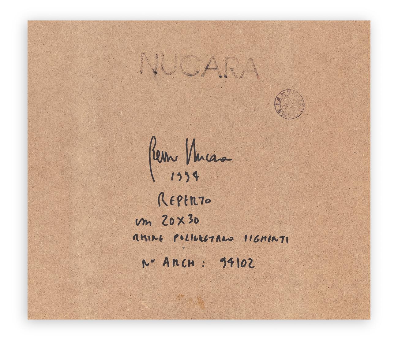 Firma, titolo, datazione, tecnica, ,misure e numero di archivio al retro