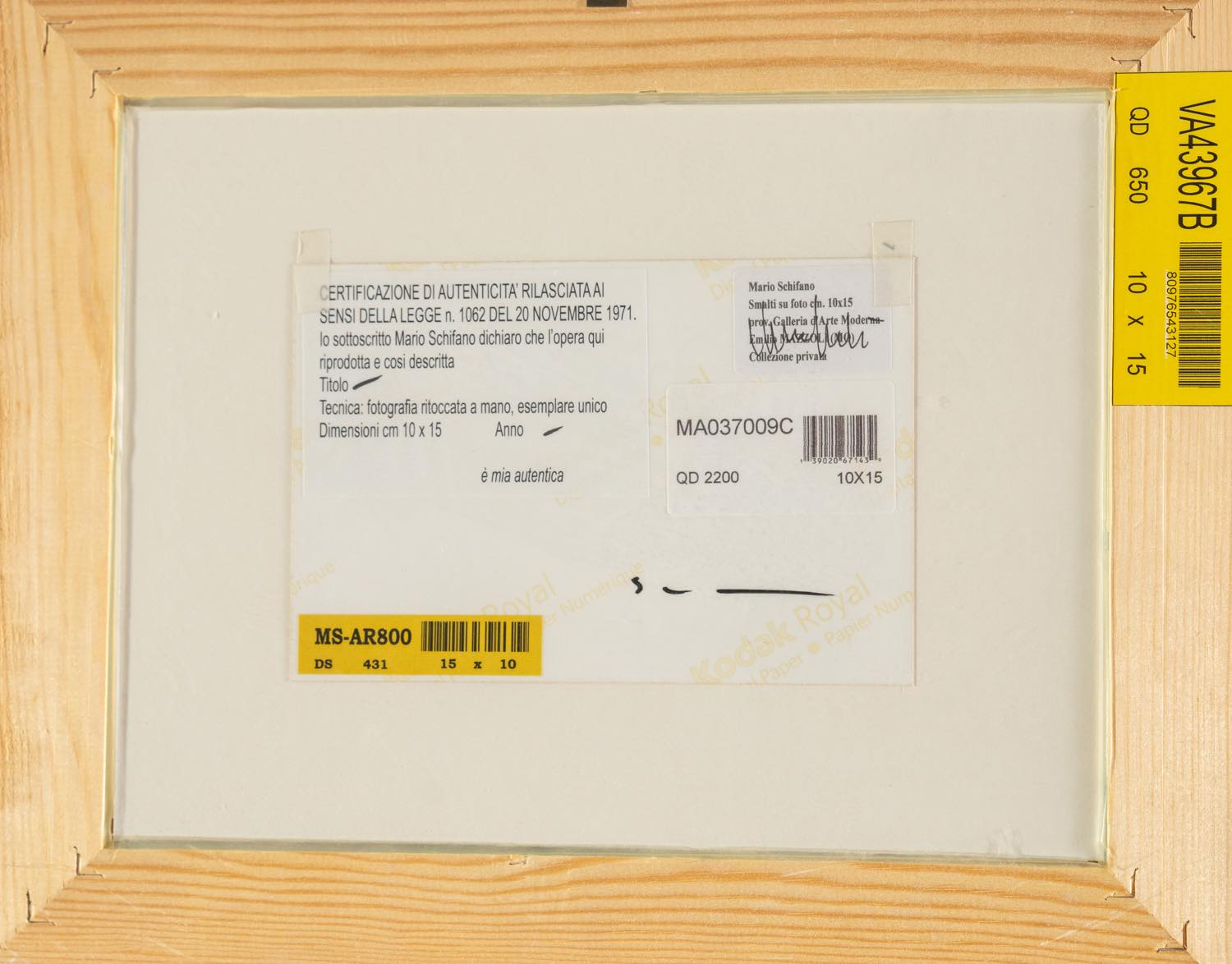 Fotografia ritoccata a mano, reca al retro firma, etichetta per certificazione di autenticità, ed etichetta relativa alla provenienza dalla Galleria Mazzoli – Modena, H cm 10x15 – con cornice H cm 24.5x30.5 - Note: Opera accompagnata da certificato di autenticità a cura di Sotheby’s – Londra con timbro della Galleria Mazzoli – Modena e da certificato di autenticità della Fondazione M.S. Multistudio – Roma con numero di archiviazione F40-35A. Provenienza: Galleria Mazzoli – Modena; Importante Collezione Privata – Bologna.