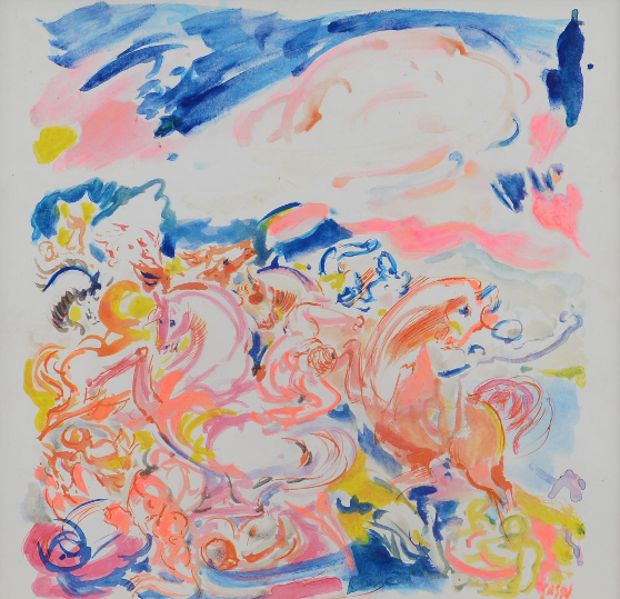 Aligi Sassu, Acquerello su carta, 34,5x34,5 cm, Cavalli ed eroi, 1983; Firmato in basso a destra; Autentica dell'artista su foto