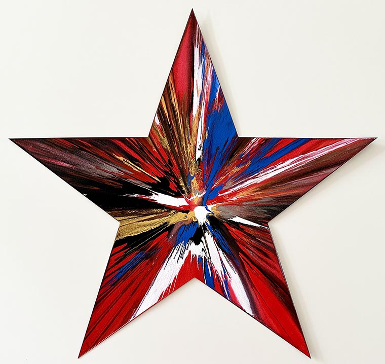 Damien Hirst, Acrilico su carta, 52x52 cm, Star, 2009; L'opera è stata realizzata per celebrare l'apertura di "Damien Hirst Requiem" al PinchukArtCenter di Kiew; L'opera ha la firma e il timbro dell'artista sul retro