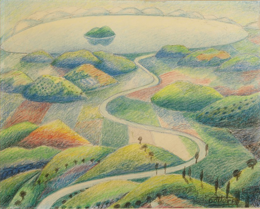 Gerardo Dottori, Idromatita e pastelli su carta, 32x25,7 cm, Paesaggio umbro, 1954; Firma e anno in basso a destra. Dedica al retro all'amico Giorgio Cimino. Autentica su foto del Dott. Massimo Duranti, curatore del Catalogo Generale Ragionato