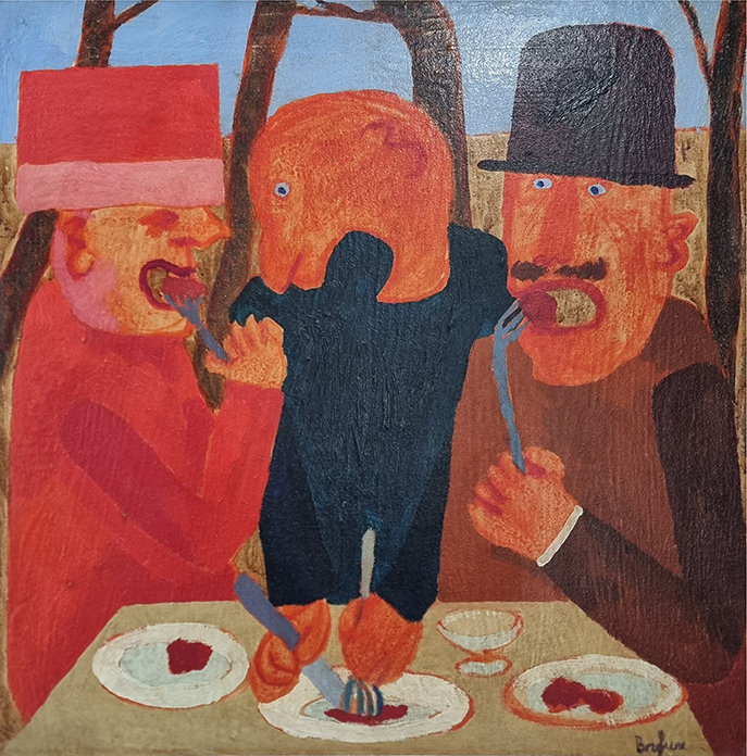 Franz Borghese, Olio su tela, 50x50 cm, I mangiatori, 1978; Firmato in basso a destra