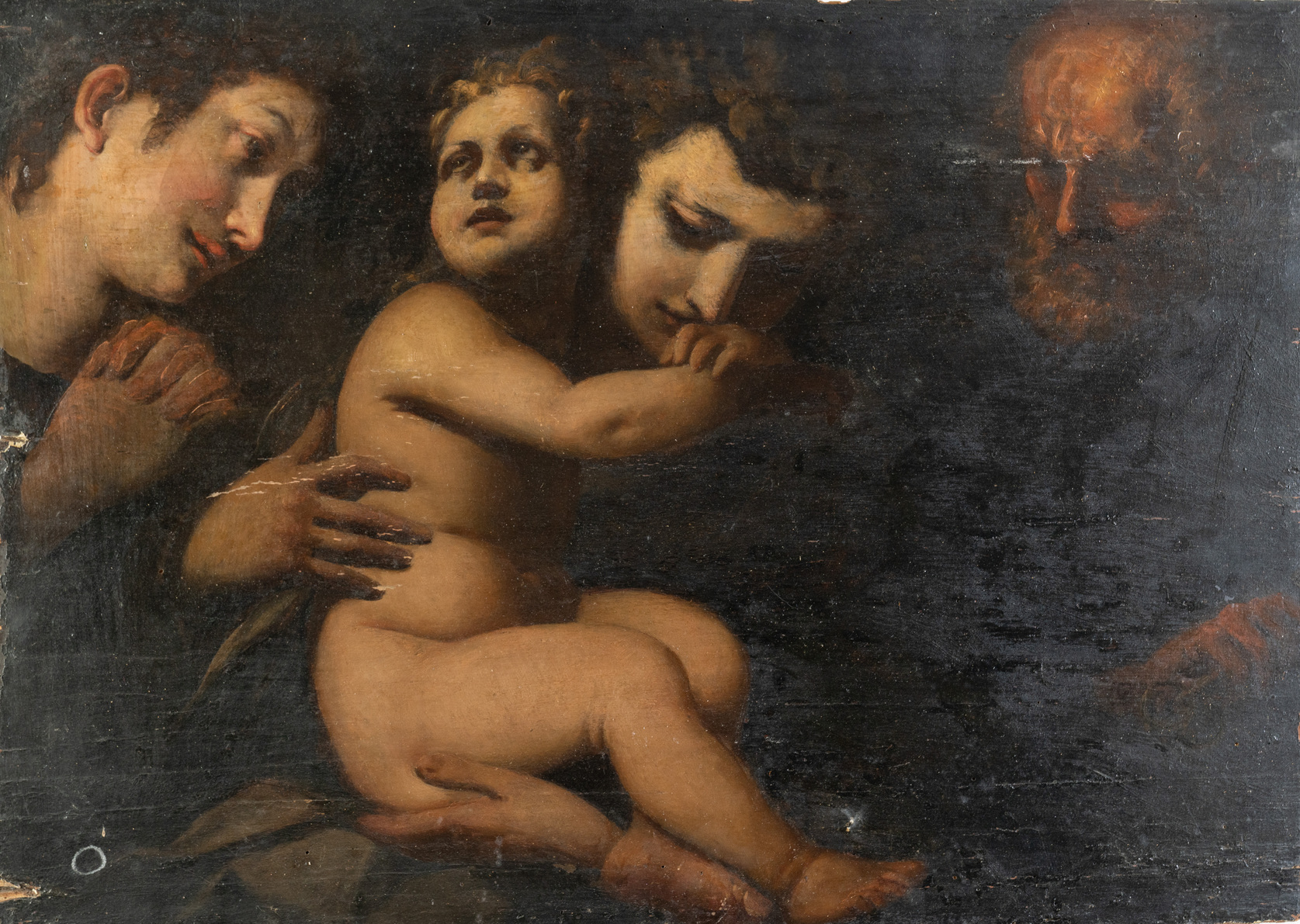 Ambito di Giulio Cesare Procaccini (Bologna 1574 – Milano 1625). Sant'Antonio da Padova con Bambino, angelo e frate. Olio su tavola. Cm. 49,5x69. Difetti.