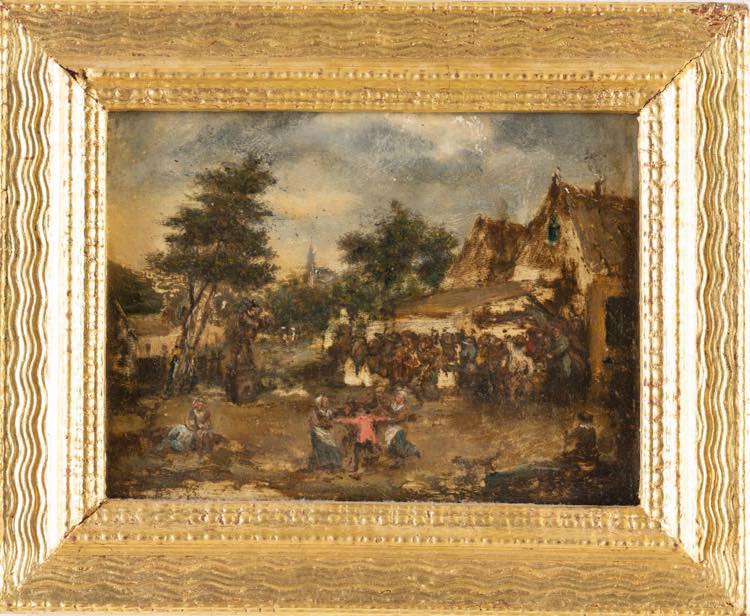 Maestro fiammingo del XVIII secolo. Festa paesana. Olio su tavola. Cm. 18x24.