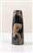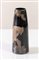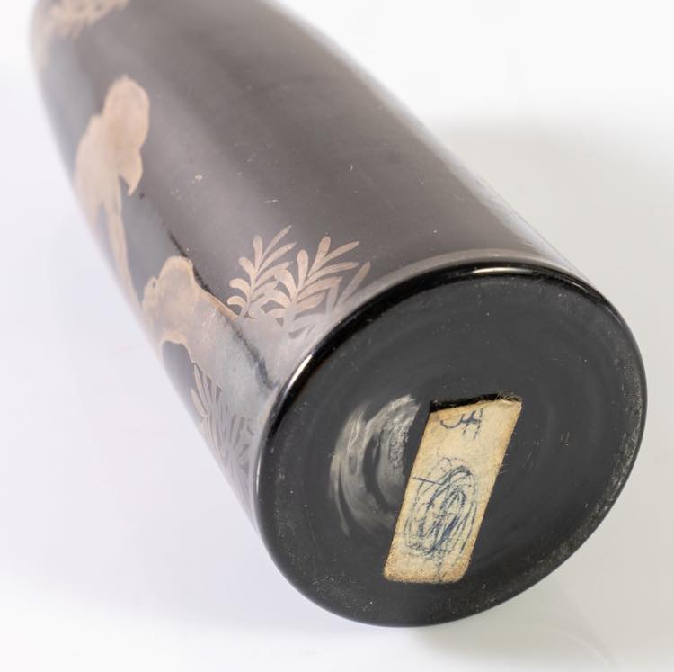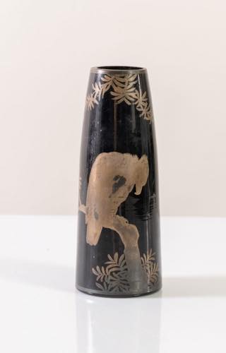 Piccolo vaso in vetro nero, XX secolo. Con decorazione di foglie e uccello dipinti. Cm. 14,5x5,5.