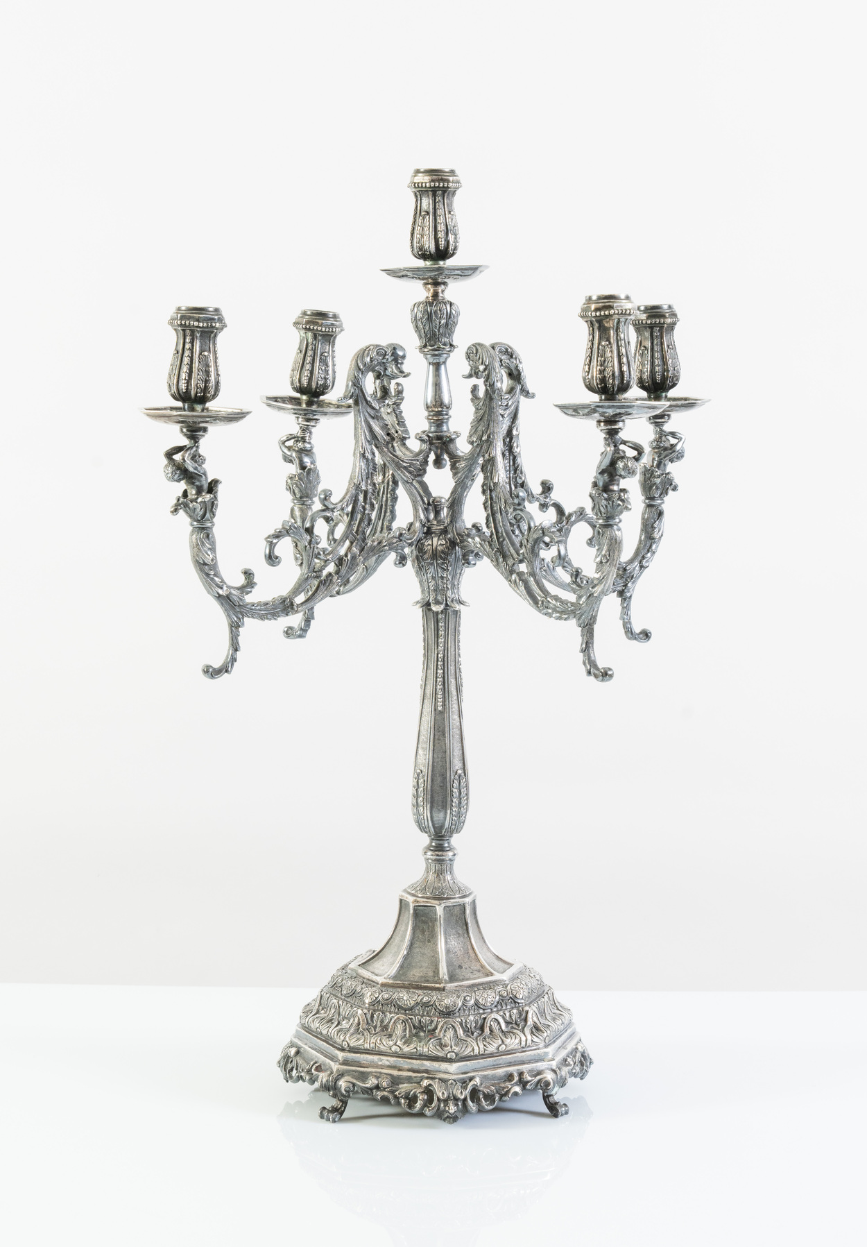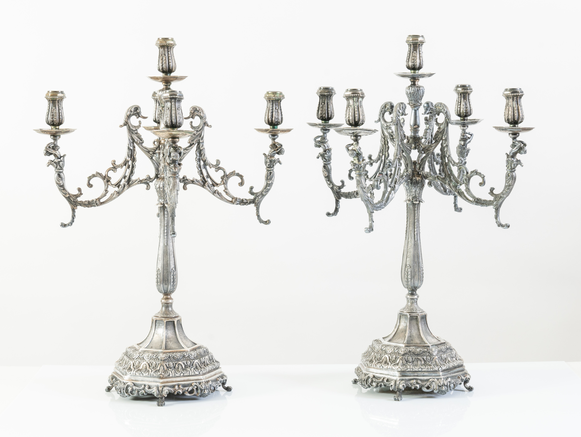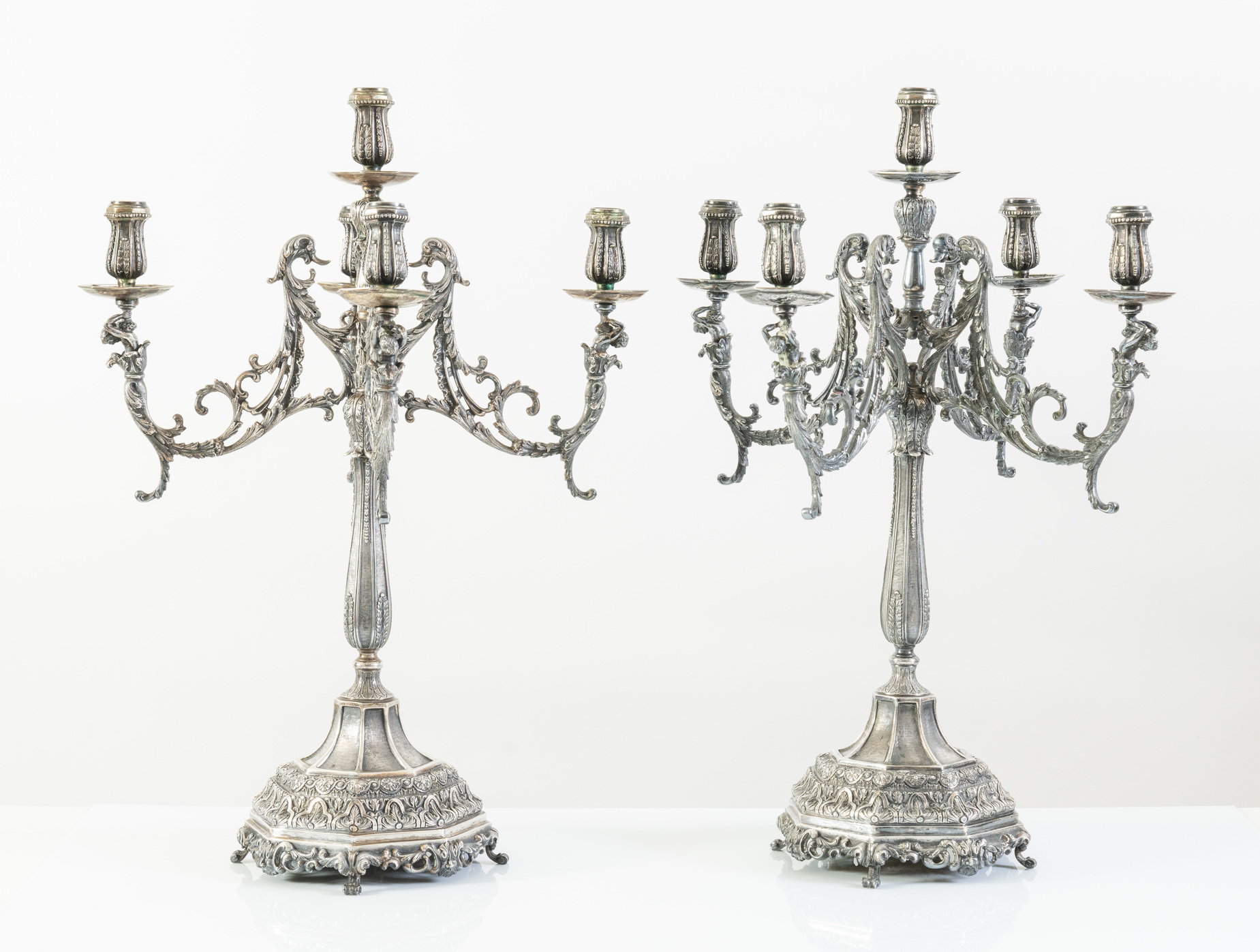 Manifattura italiana, Firenze, anni '60 del XX secolo. Coppia di candelabri a 5 fiamme in argento cesellato. Punzoni F.I.D.A.M. Pini Aldo & C. S.d.f. Titolo 800. Peso tot. gr. 12.000. Altezza cm. 65. La base ottagonale modanata e decorata a motivi vegetali sorregge un alto fusto a balaustro da cui si dipartono quattro bracci a volute e ramages, caratterizzate da teste di cigno e quattro putti in posa di telamone reggi bobeches. Misura delle diagonali cm. 45×45. Base ottagonale cm. 21.