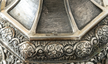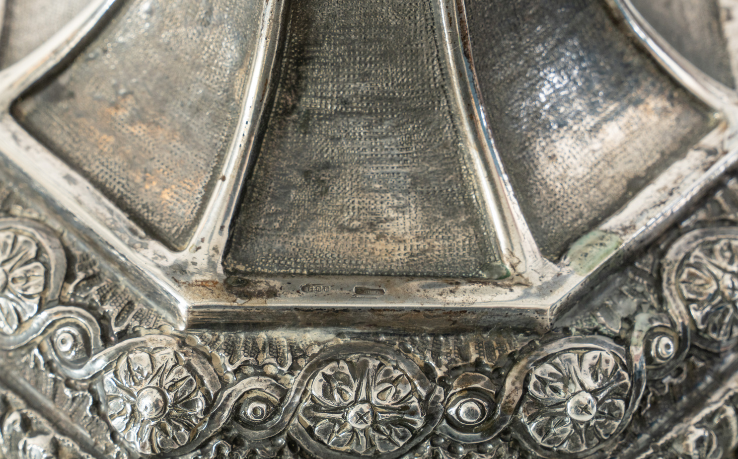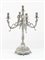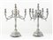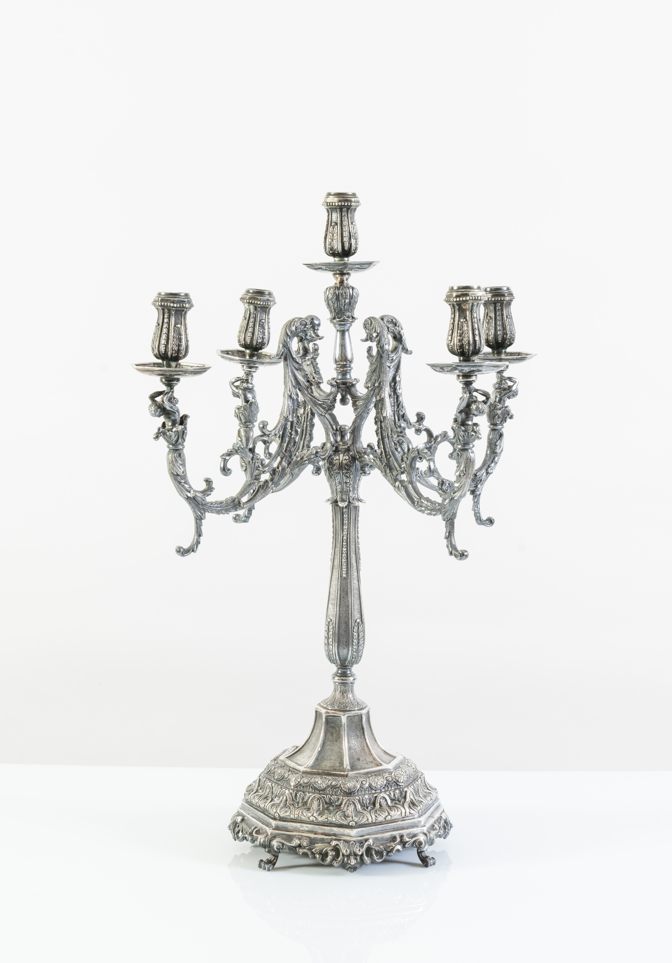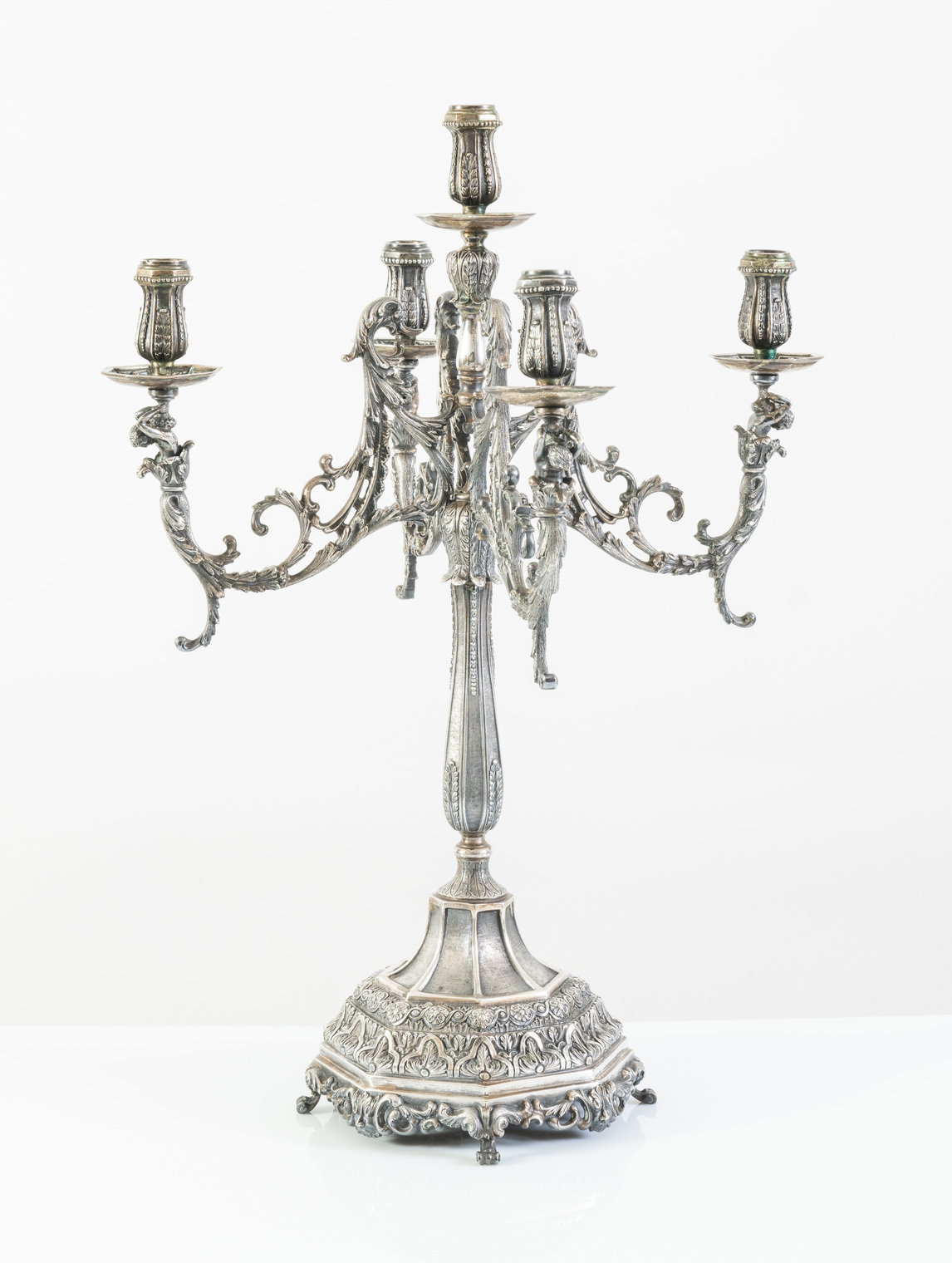 Manifattura italiana, Firenze, anni '60 del XX secolo. Coppia di candelabri a 5 fiamme in argento cesellato. Punzoni F.I.D.A.M. Pini Aldo & C. S.d.f. Titolo 800. Peso tot. gr. 12.000. Altezza cm. 65. La base ottagonale modanata e decorata a motivi vegetali sorregge un alto fusto a balaustro da cui si dipartono quattro bracci a volute e ramages, caratterizzate da teste di cigno e quattro putti in posa di telamone reggi bobeches. Misura delle diagonali cm. 45×45. Base ottagonale cm. 21.