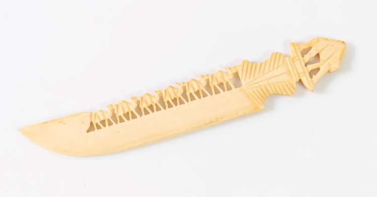 Tagliacarte in osso, XIX-XX secolo. Con decorazione di cammelli scolpiti. Lunghezza cm. 17,5.