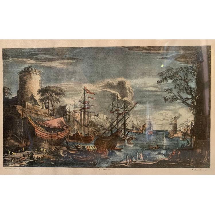 Achille Parboni (Roma 1783 -1841), Luigi Corsi (notizie 1837-1839). Paesaggio marino con navi. Stampa dal dipinto di Salvator Rosa (Napoli 1615 - Roma 1673), conservato Galleria Palatina, Uffizi, Firenze. Sul margine inferiore sinistro Salvator Rosa, al centro L. Corsi dis. Sul margine inferiore destro A. Parboni inc. Cm. 25,5x34. Con cornice e vetro.