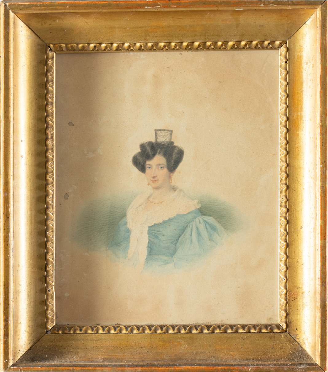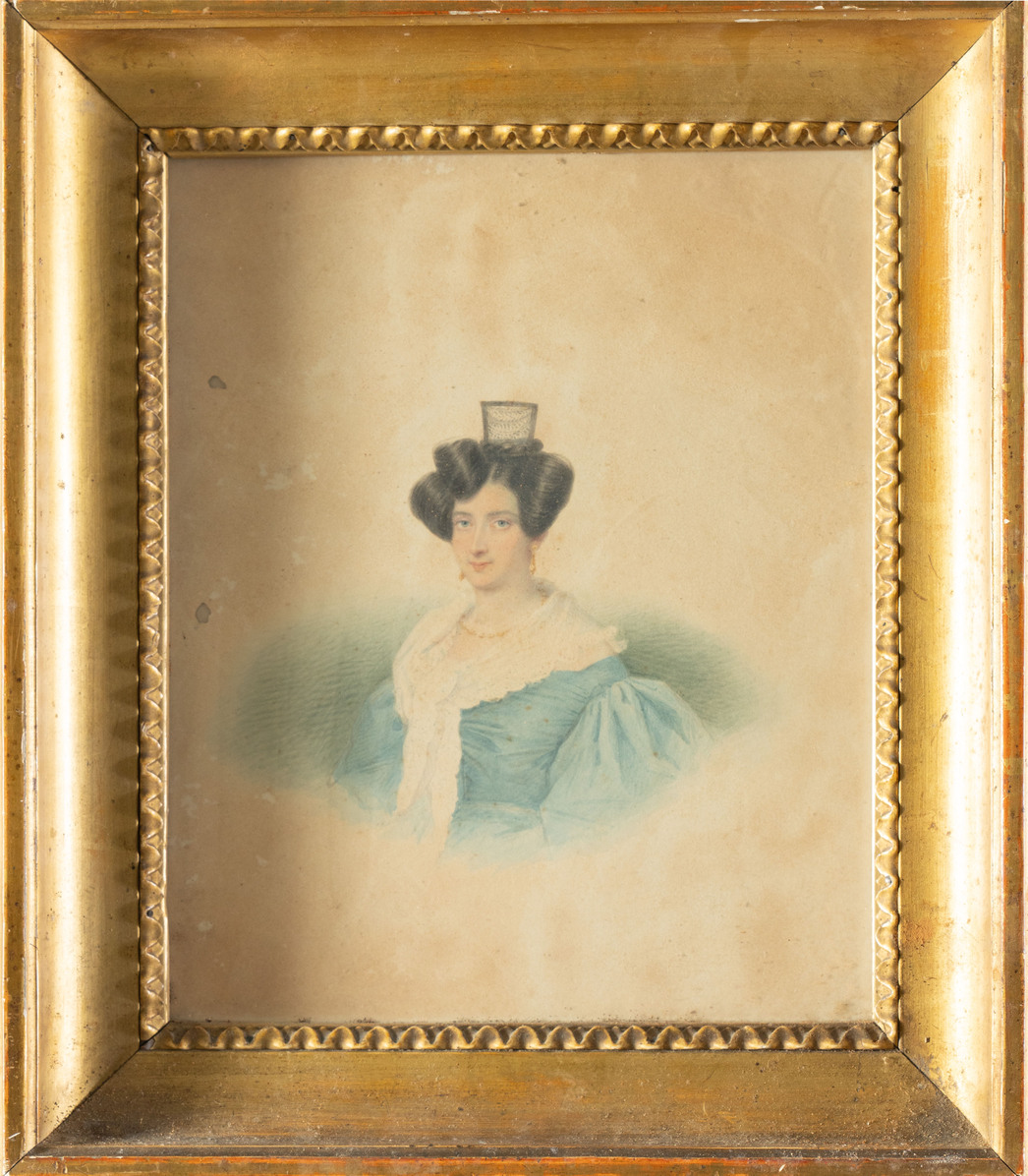 Ritratto di giovane aristocratica, XIX-XX secolo. Cm. 27x22. Con cornice cm 35x30. Acquarello su carta. Difetti, Presenta tracce di foxing.