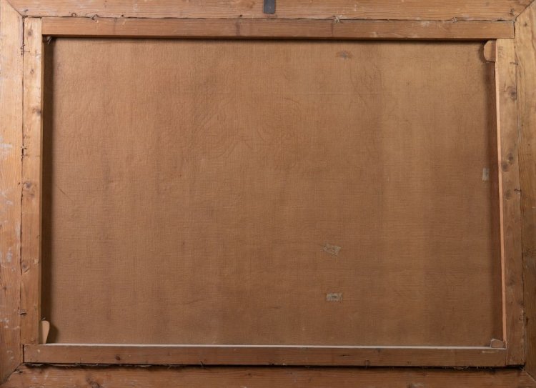 Pittore tra XIX e XX secolo. Paesaggio lacustre con alberi. Olio su tela. Cm. 90x128. In cornice cm. 108x145.