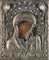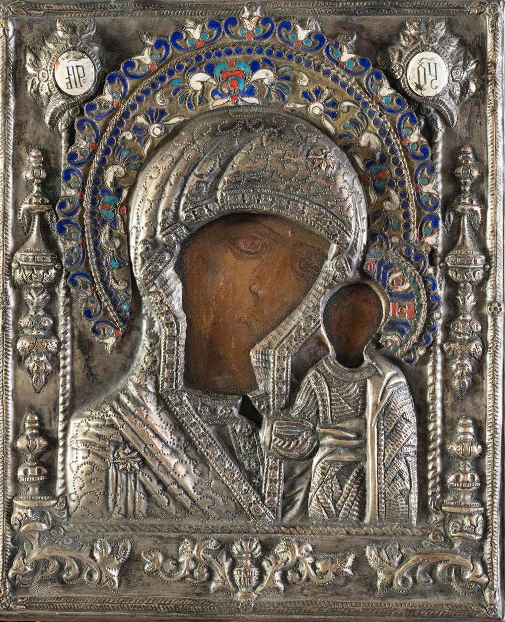 Scuola russa, fine XIX secolo. Icona Madonna di Kazan. Tempera su tavola, riza in metallo argentato decorata a smalti policromi. Difetti. Cm. 32x26,5.