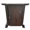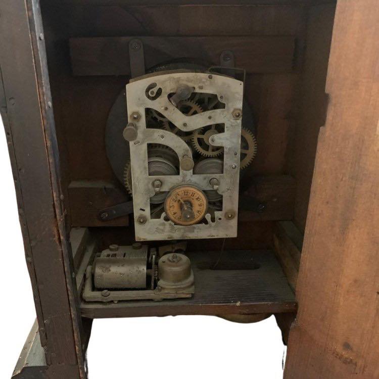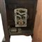 Orologio sveglia a bilancere con suoneria a carillon, circa 1880-1900. Il meccanismo è del tipo bilancere. Sul retro un piccolo sportello consente di aprire il vano del meccanismo per la carica delle molle, l'impostazione della sveglia e la messa in orario dell'orologio. Cassa in legno con elementi bronzo. Antica etichetta non leggibile sulla parte interna dello sportellino posteriore. Cm. 28x25x13