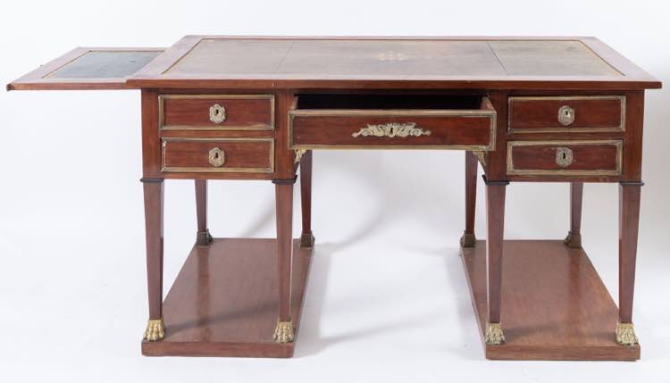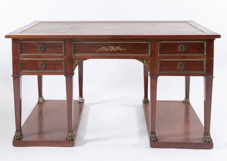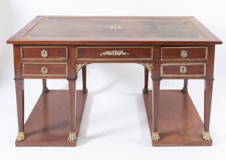 Scrivania da centro lastronata in mogano con piano in cuoio e bordo dorato con motivo di sfingi. Francia, fine XIX e inizio XX secolo. Reca in fascia cinque cassetti sostegni a tronco di piramide poggianti su basi terminanti con piedi ferini in bronzo dorato. Cm. 80x136,5x66,5.
