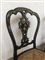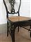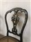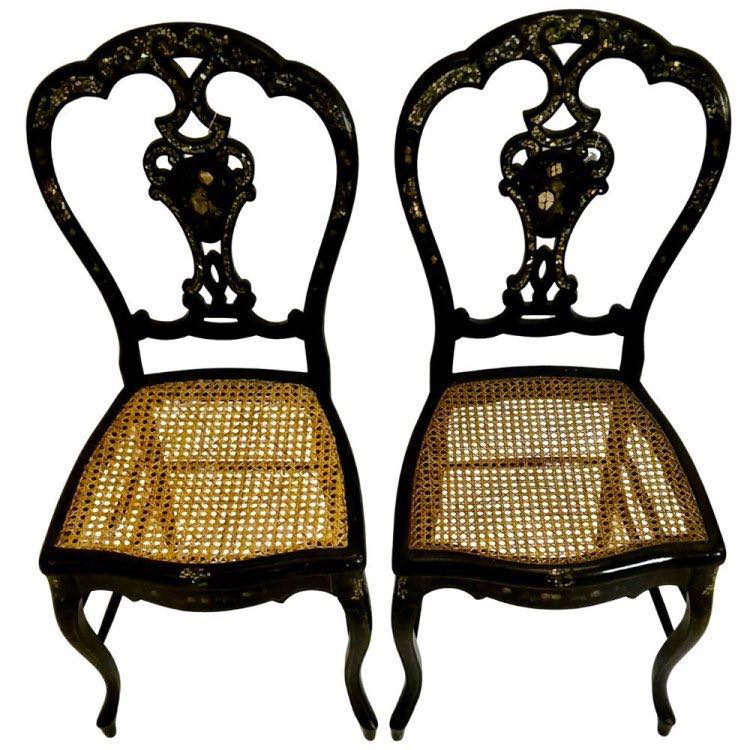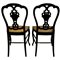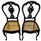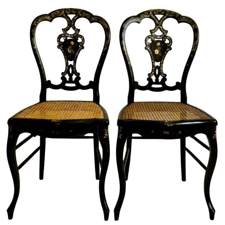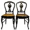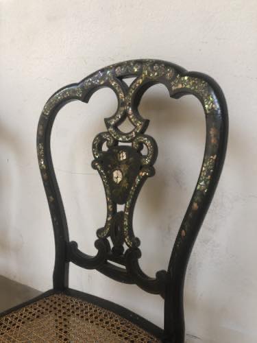 Coppia di sedie, XIX secolo. Dorsale a giorno e gambe anteriori mosse. Intarsi in madreperla e motivi floreali dipinti. Seduta in cannetè. Cm. 50x30.