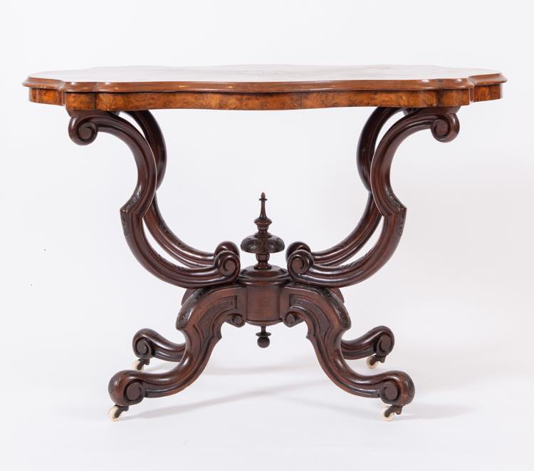 Tavolo polilobato con intarsi in acero. Inghilterra, periodo vittoriano, XIX secolo.
