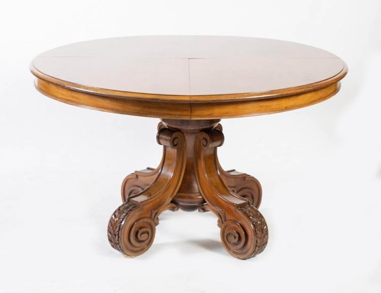 Manifattura italiana, seconda metà del XIX secolo. Tavolo rotondo allungabile in massello di noce. Fusto centrale tornito, sorretto da quattro piedi a mensola intagliati con motivi a foglie d'acanto. Piano a becco di civetta.