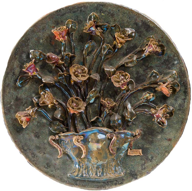 Sante Tassinari (Faenza 1910 - 2006). Piatto in maiolica a lustro. Decorato con vaso di fiori in altorilievo. Firmato Tassinari Faenza. Diametro cm. 42,5.