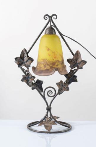 Degué, Francia, circa 1900. Lampada da tavolo. Base in ferro battuto e motivi a tralci di edera. Paralume in pasta di vetro a forma di calice di fiore rovesciato, nelle gradazioni del giallo e del colore castagna. Firma incisa Degué su paralume