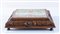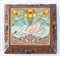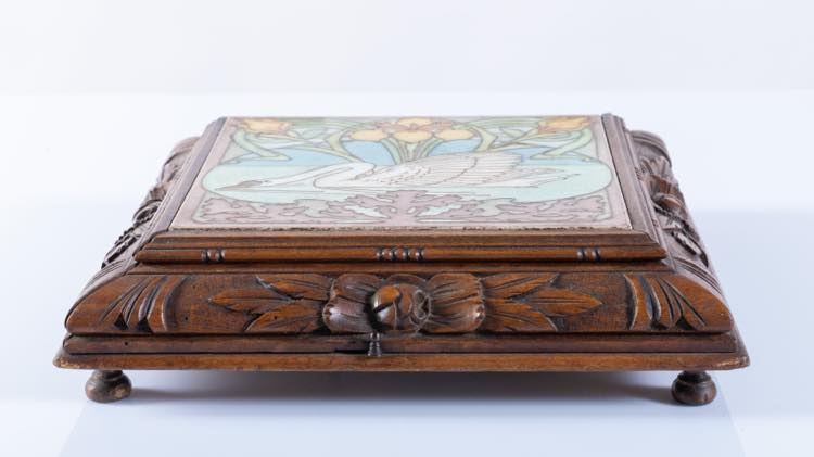 Carillon in legno intagliato. Italia, fine del XIX secolo - inizio del XX secolo. Con motivi a foglie contrapposte. Decorato dall'inserimento di una mattonella di maiolica raffigurante cigno e iris gialli. Cm. 7x30x30.