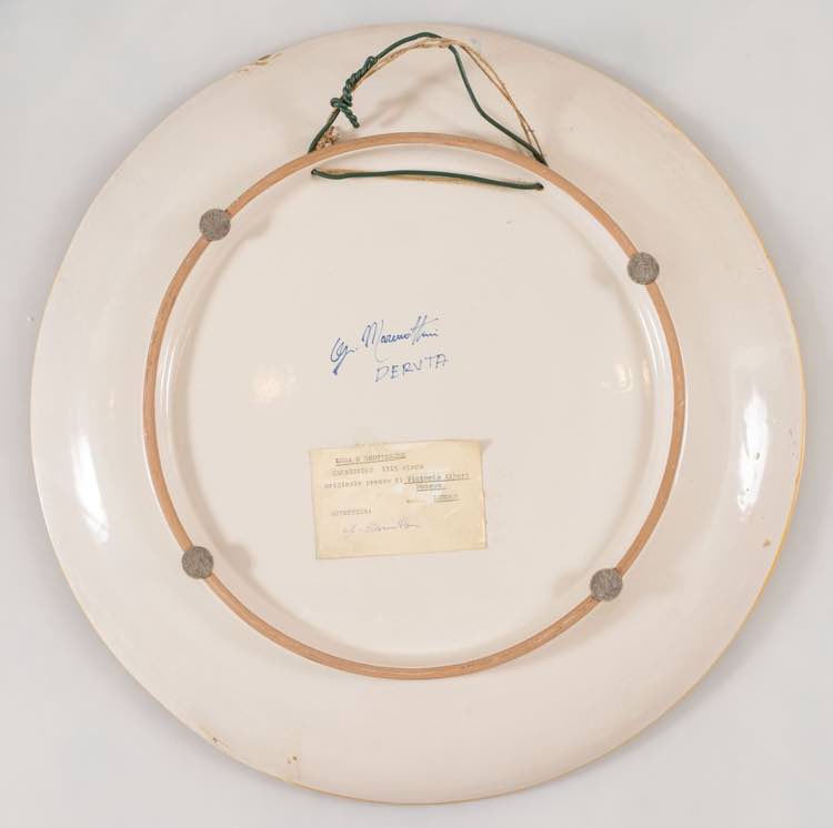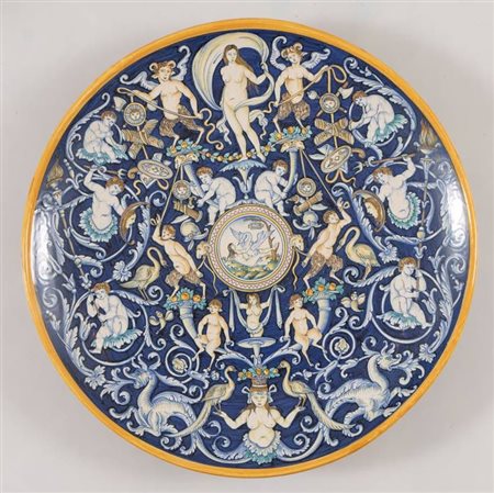 Maioliche G. Marmottini, Deruta. Leda e grottesche. Piatto da parata in maiolica policroma. Firmato sotto la base G. Marmottini DERUTA. Copia da Cafaggiolo, 1515 circa. Sotto la base cartiglio con autenntica firmata G. Marmottini. Diametro cm. 51,5. Altezza cm. 6.