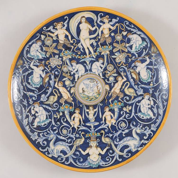 Maioliche G. Marmottini, Deruta. Leda e grottesche.