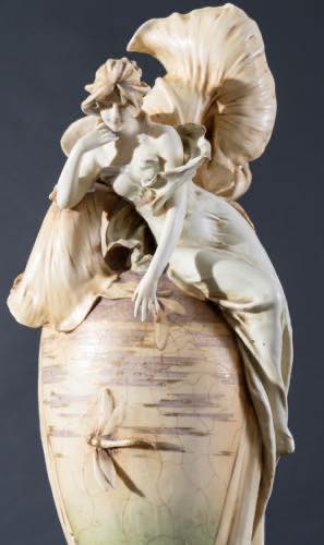 AMPHORA, Riessner, Stellmacher & Kessel, 1900 circa. Coppia di vasi in porcellana policroma. Da un modello di Eduard Stellmacher. Ciascun vaso sormontato da iris a grandi petali e figura di giovane donna con drappeggio evanescente. Decorazione in rilievo a tela di ragno sul corpo di ciascun vaso con applicate libellule. Alla base decorazione a spirale di foglie di iris. Sotto la base marchio impresso AMPHORA in un ovale, marchio stampato in rosso TURN-TEPLITZ-BOHEMIA R St K, cifre impresse 740, 1 e 748, 2. Rispettivamente cm. 54x20x20 e cm. 53x19x20 .