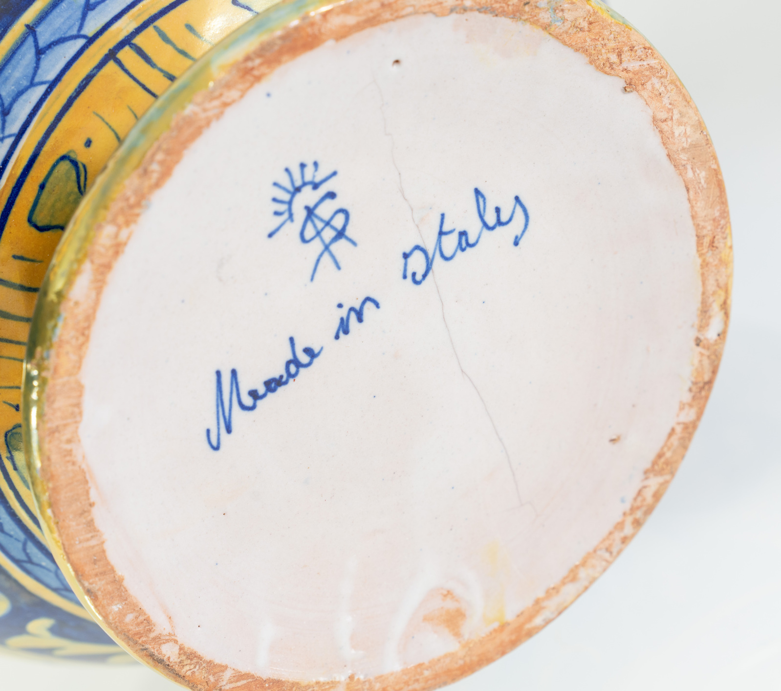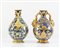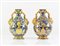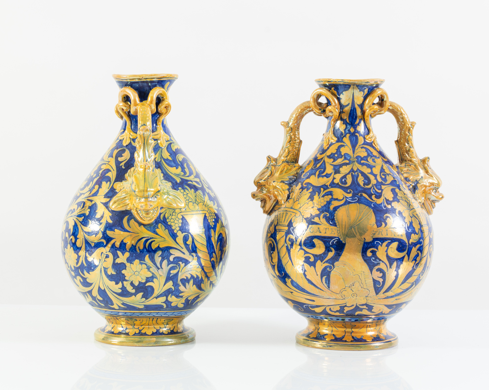 Manifattura Gualdo Tadino, fornace Alfredo Santarelli (1874- 1957), prima metà XX secolo. Coppia di vasi in ceramica a lustro oro su fondo blu, decorati con profili rinascimentali, tralci vegetali e cornucopie. Anse a foggia di mostri marini. Base circolare. Lievi difetti, felature. Ciascuno cm. 33x12,2 alla base.