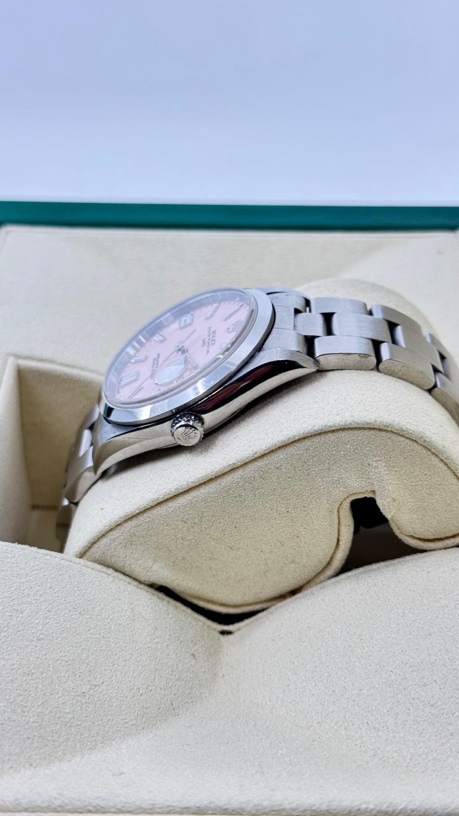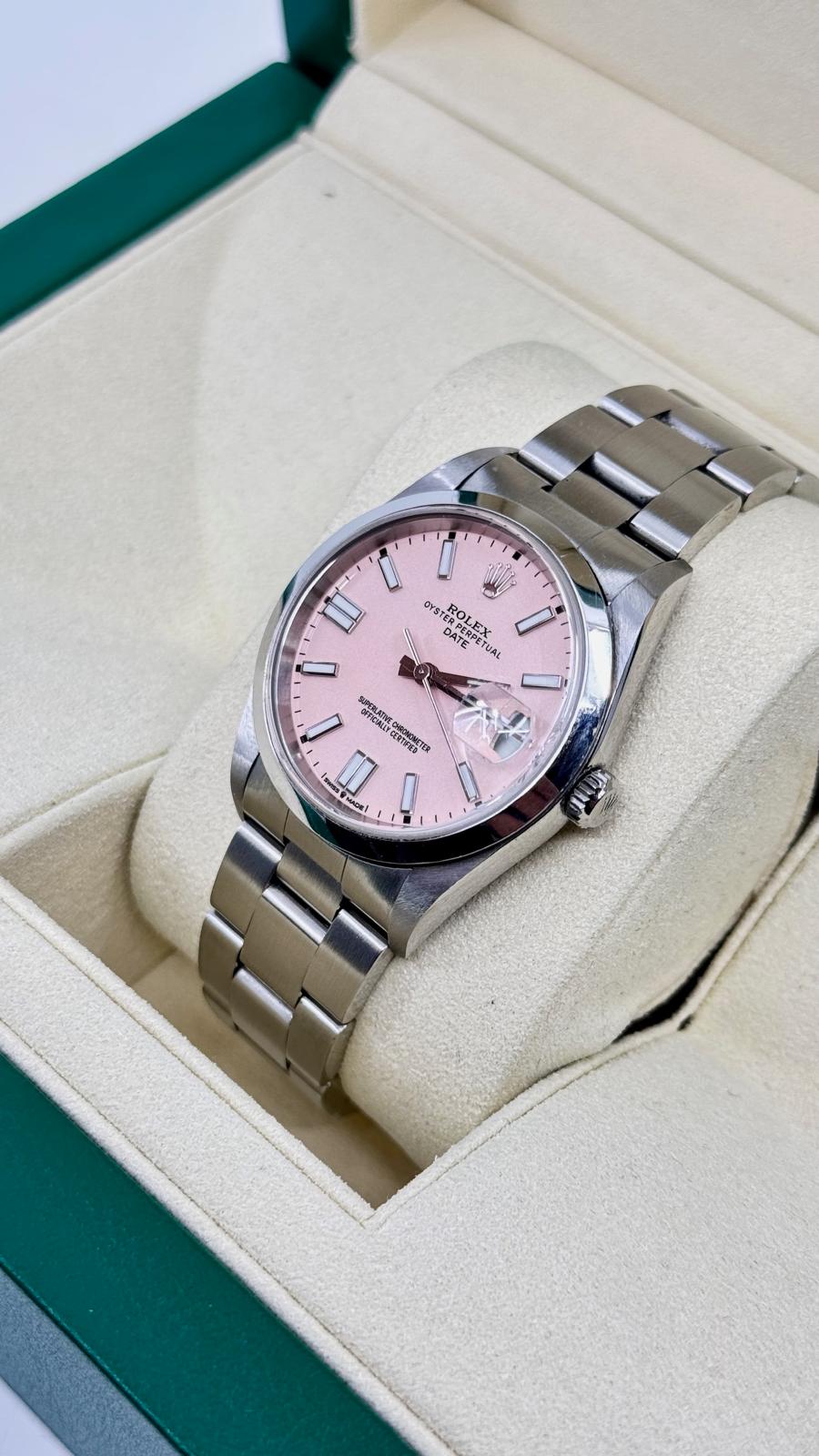 Marca Rolex Modello oyster perpetual date Ref 15200 Anno 1999 Condizione usato Misura 34 Vetro zaffiro Cassa no fori Quadrante aftermarket rosa e bianco originale Cinturino oyster Corredo Garanzia Rolex, no box la scatola utilizzata solo per fotografie non in vendita