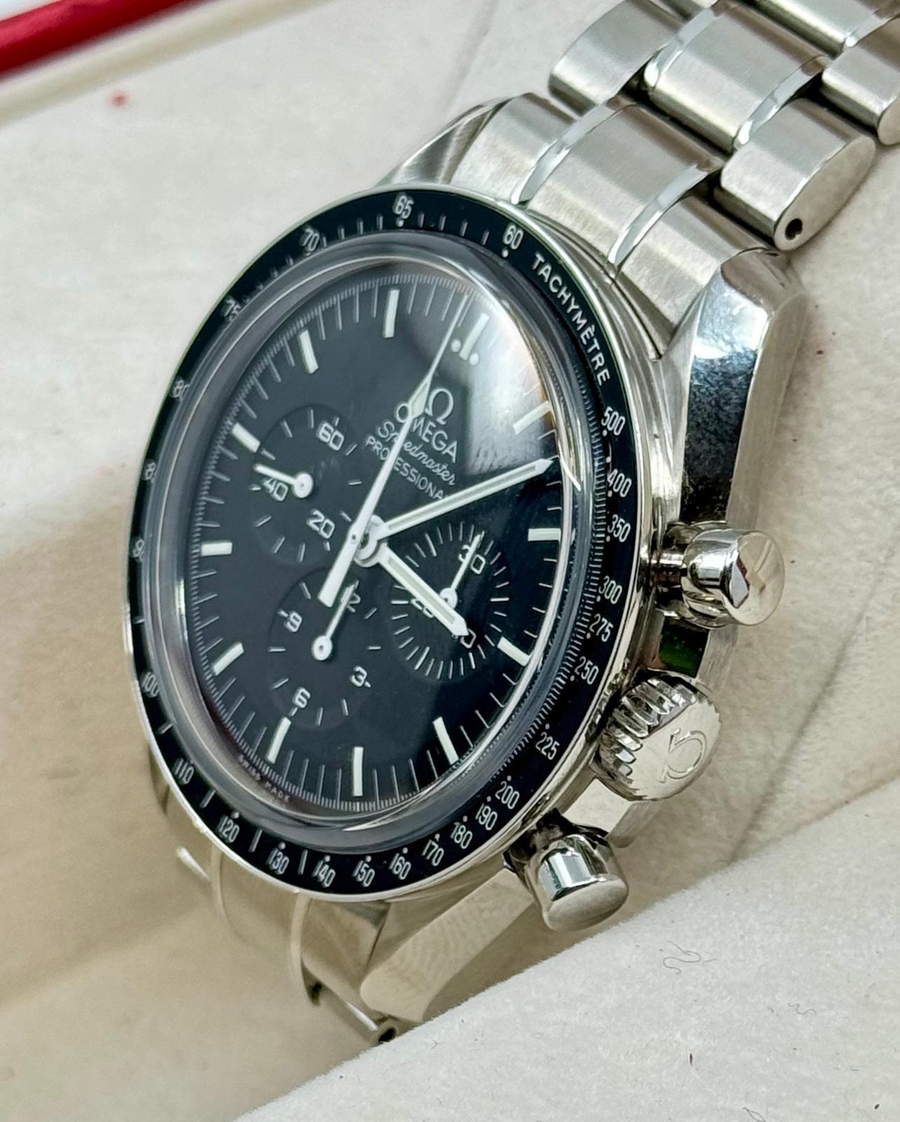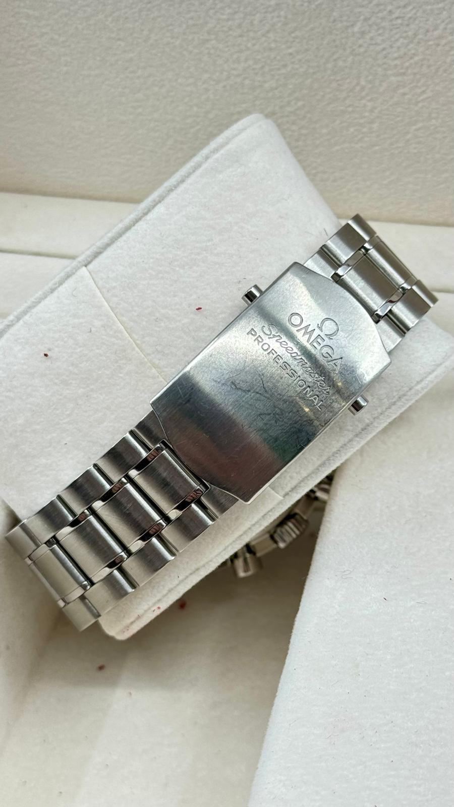Marca Omega Modello (Orologio) Speedmaster Professional Moonwatch Numero di referenza 345.0022 Carica Manuale Materiale della cassa Acciaio Materiale cinturino Acciaio Anno di produzione 2005 documenti originali, no box Calibro Carica Manuale Calibro/Meccanismo 1861 Materiale della cassa Acciaio Diametro 42 mm Impermeabile 5 ATM Materiale lunetta Acciaio Vetro Plexiglas Numeri sul quadrante Senza numeri Cinturino Materiale cinturino Acciaio Colore cinturino Acciaio Chiusura Déployante Materiale chiusura Acciaio Funzioni Cronografo