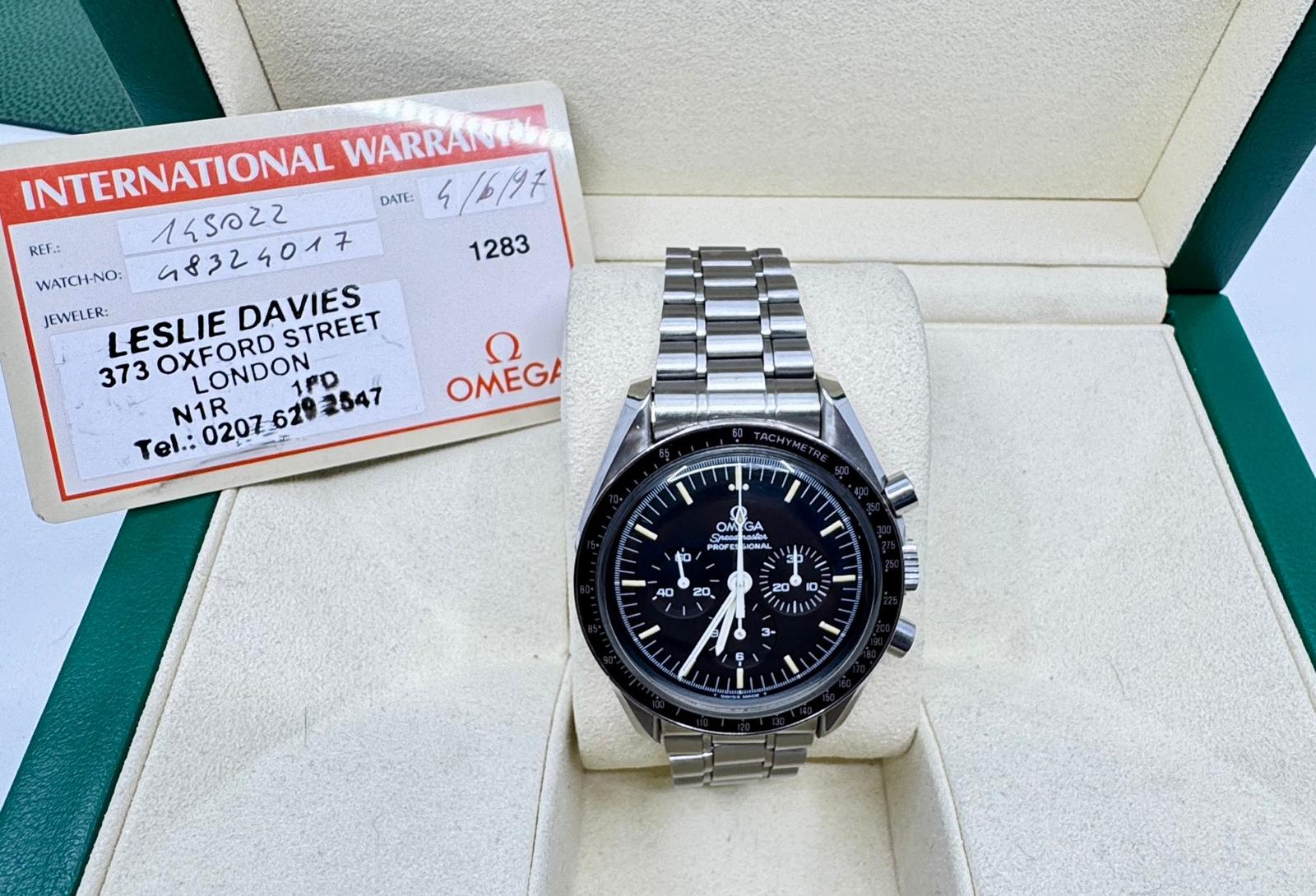 Marca Omega Modello (Orologio) Speedmaster Professional Moonwatch Numero di referenza 145.022 Carica Manuale Materiale della cassa Acciaio Materiale cinturino Acciaio Anno di produzione 1992 Condizione Usato (Ottimo) L'articolo presenta segni di usura lievi, come ad esempio graffi leggeri, ma non percepibili al tatto. Corredo documenti originali, no box Carica Manuale Calibro di base 861 Materiale della cassa Acciaio Diametro 42 mm Materiale lunetta Alluminio Vetro plexiglass Cinturino Materiale cinturino Acciaio