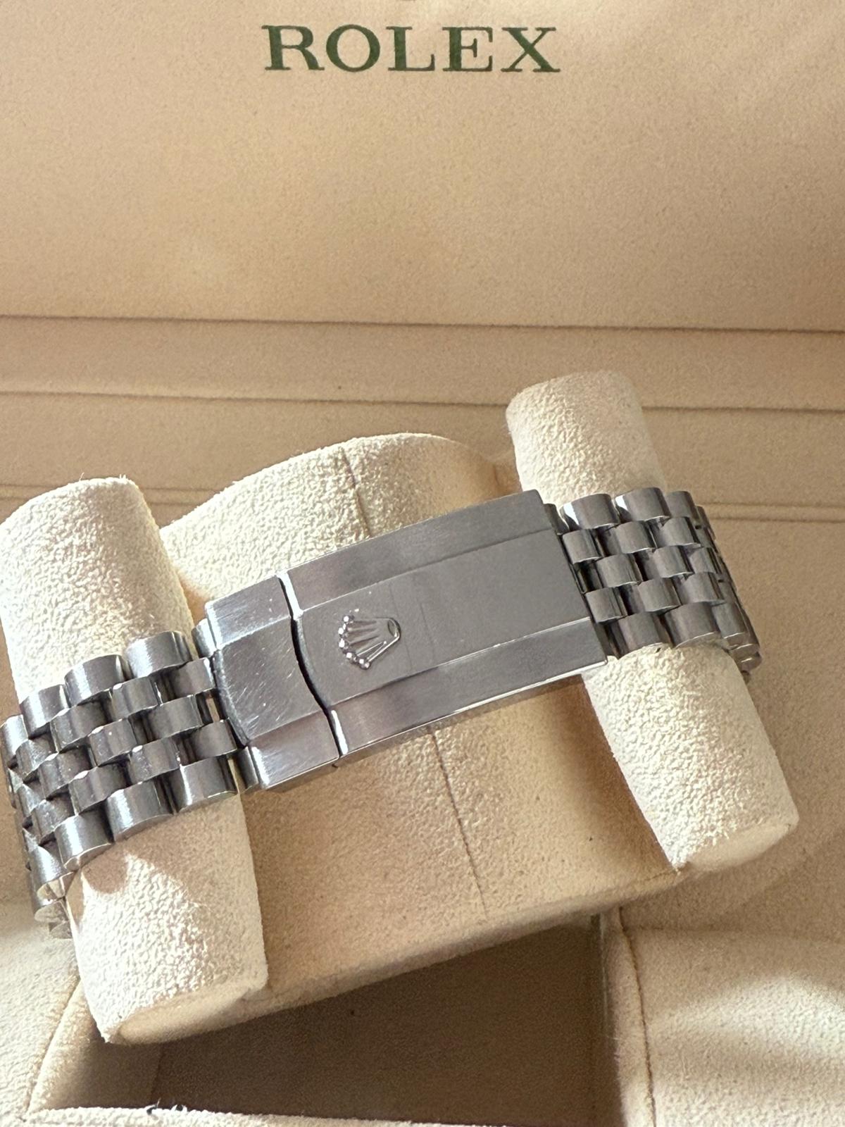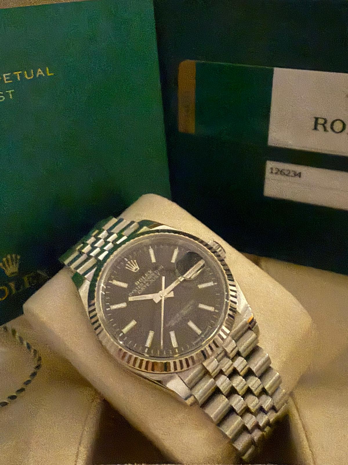 Marca Rolex Modello (Orologio) Datejust 36 Numero di referenza 126234 Carica Automatico Materiale della cassa Acciaio Materiale cinturino Acciaio Anno di produzione 2020 Corredo documenti originali, no box Calibro Carica Automatico Cassa Materiale della cassa Acciaio Diametro 36 mm Impermeabile 10 ATM Materiale lunetta Oro bianco Vetro Vetro zaffiro Cinturino Materiale cinturino Acciaio Colore cinturino Acciaio Chiusura Déployante