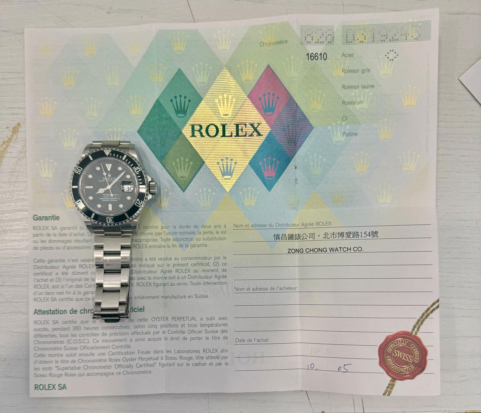 Marca Rolex Modello (Orologio) Submariner Date Numero di referenza 16610 Carica Automatico Materiale della cassa Acciaio Materiale cinturino Acciaio Anno 2005 Corredo documenti originali, no box la scatola è utilizzata solo per fotografie non in vendita Materiale della cassa Acciaio Diametro 40 mm Impermeabile 30 ATM Materiale lunetta Acciaio Vetro Vetro zaffiro Numeri sul quadrante Senza numeri Cinturino Materiale cinturino Acciaio Colore cinturino Acciaio Chiusura Déployante Materiale chiusura Acciaio Cassa no fori