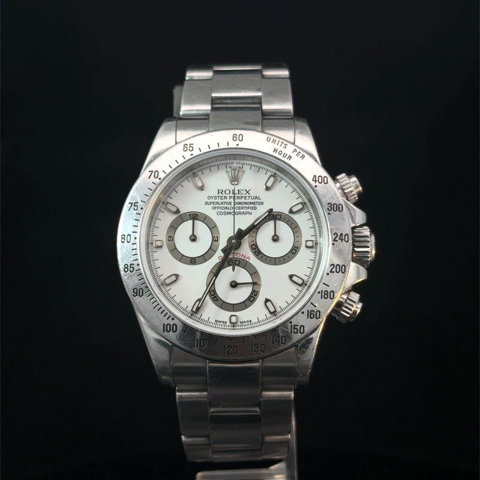 Marca Rolex Modello (Orologio) Daytona Numero di referenza 116520 Carica Automatico Materiale della cassa Acciaio Materiale cinturino Acciaio Anno di produzione 2003 documenti originali Rolex, no box Carica Automatico Cassa Materiale della cassa Acciaio Diametro 40 mm Impermeabile 10 ATM Materiale lunetta Acciaio Vetro Vetro zaffiro Quadrante bianco Cinturino Materiale cinturino Acciaio Colore cinturino Acciaio Chiusura Déployante Materiale chiusura Acciaio