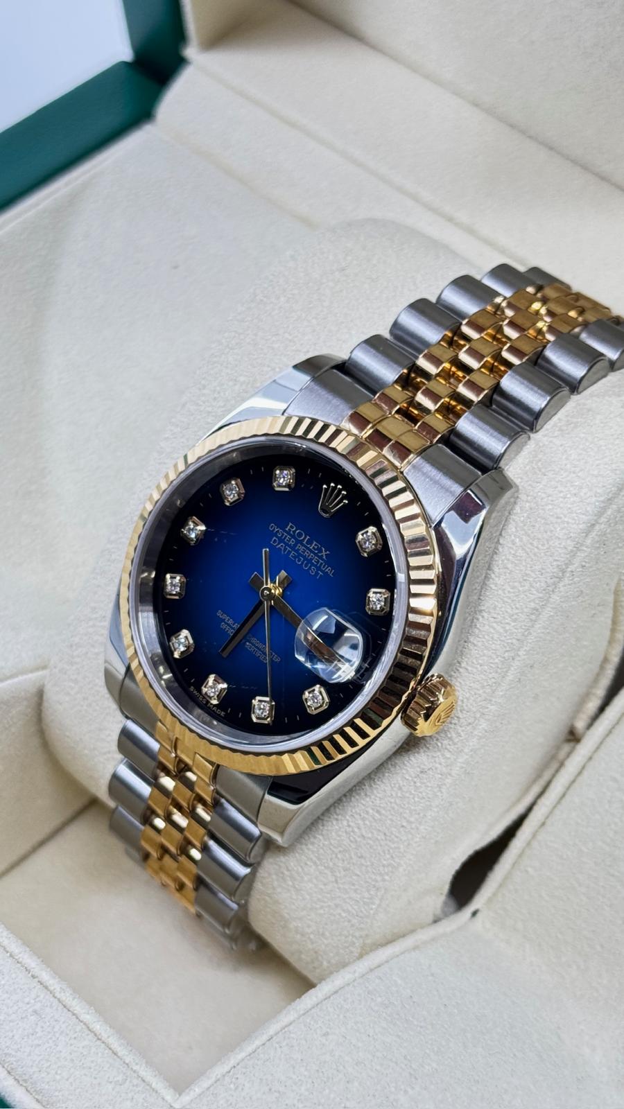 Marca Rolex Modello (Orologio) Datejust 36 Numero di referenza 116233 Quadrante con degrade con diamanti Lunetta aftermarket con diamanti veri Carica Automatico Materiale della cassa Oro/Acciaio Materiale cinturino Oro/acciaio Anno 2005 Condizione Usato (Ottimo) L'articolo presenta segni di usura lievi, come ad esempio graffi leggeri, ma non percepibili al tatto. Corredo documenti originali, no box la scatola utilizzata solo per fotografie non in vendita Diametro 36 mm Impermeabile 10 ATM Materiale lunetta Oro giallo Vetro Vetro zaffiro Cinturino Materiale cinturino Oro/acciaio Colore cinturino Oro/acciaio