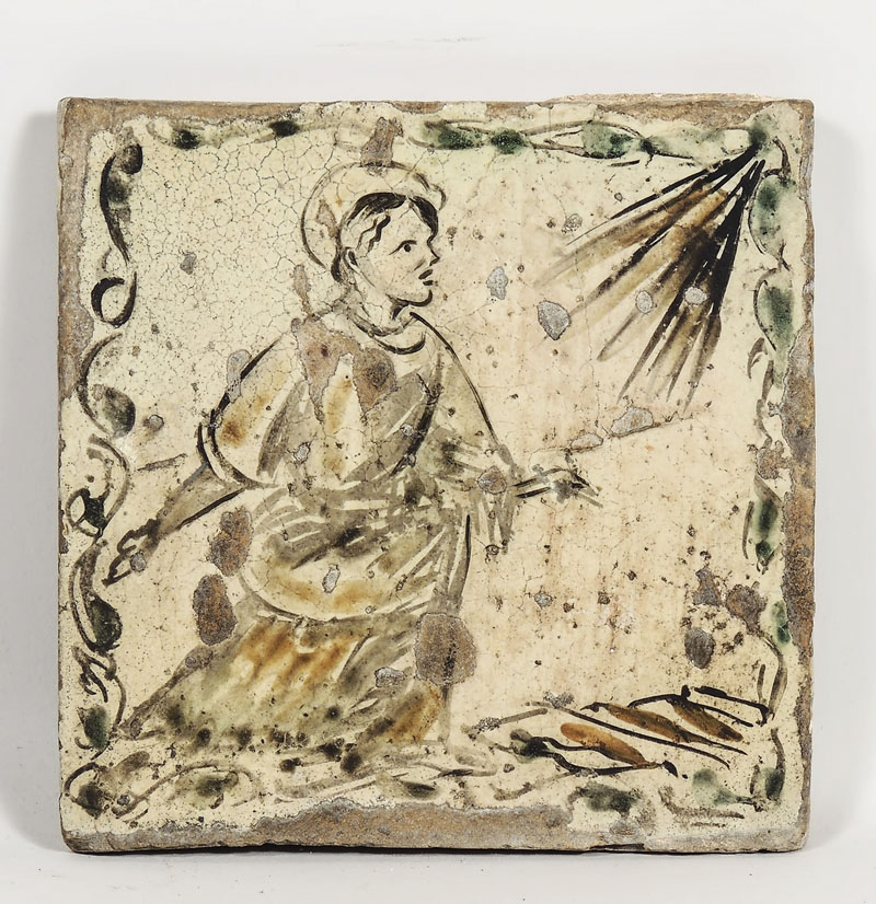 MATTONELLA IN TERRACOTTA SMALTATA - GLAZED TERRACOTTA TILE dipinta con figura di santo nei toni del marrone, difetti cm 20x20