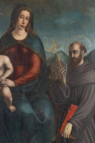 Cerchia di Francesco Bianchi Ferrari (Ferrara 1447-1510). Madonna con il Bambino tra i Santi Giovanni Evangelista e Francesco.