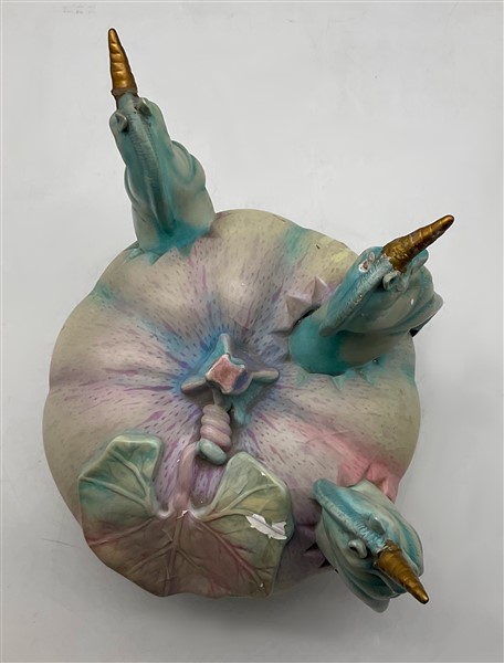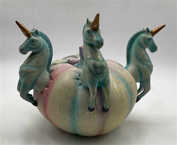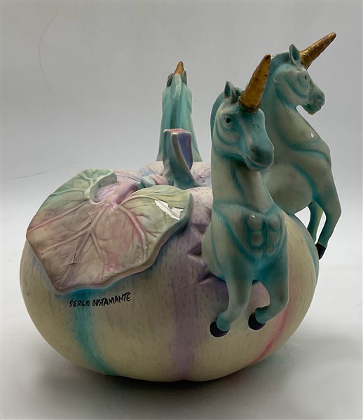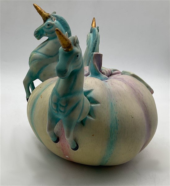 scultura in terracotta dipinta, con frutto e tre unicorni