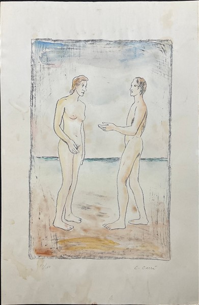 Carlo Carrà "Gli amanti" 1944 litografia acquerellata cm 50x32,5 firmata e numer
