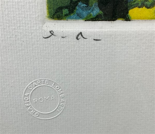 firmata in basso a destra a matita, timbro a secco Grafica d'Arte Lombardi, Roma in basso a sinistra. In cornice