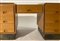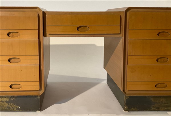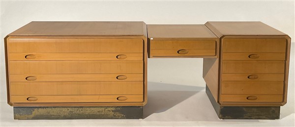 Cassettiera/toilette a tre sezioni, tre cassetti nei due lati e uno centrale in legno chiaro impiallacciato. Italia, anni '70. (cm 201x69,5x52,5) (difetti)