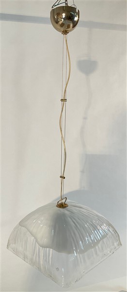 Lampada a sospensione con struttura in metallo ottonato e diffusore in vetro soffiato lattimo e trasparente incolore. Italia, anni '80/'90. (cm 42x103x42)