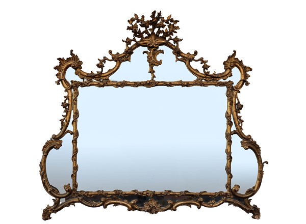 Grande specchiera in legno intagliato e dorato con decoro a volute fogliate, cimasa sormontata da fiori. Secolo XVIII (cm 160x140) (difetti)